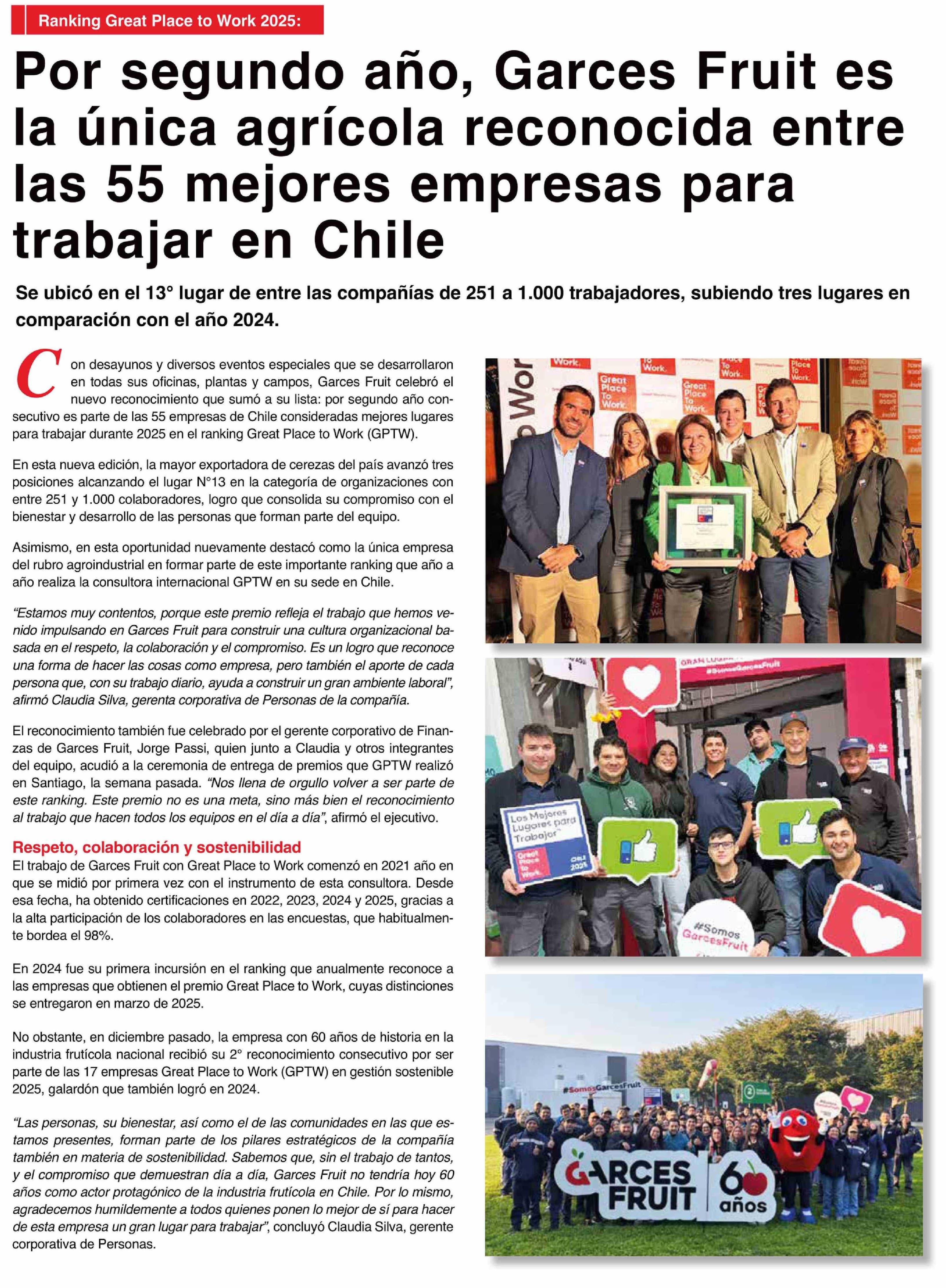 Título: Por segundo año, Garces Fruit es la única agrícola reconocida entre las 55 mejores empresas para trabajar en Chile
