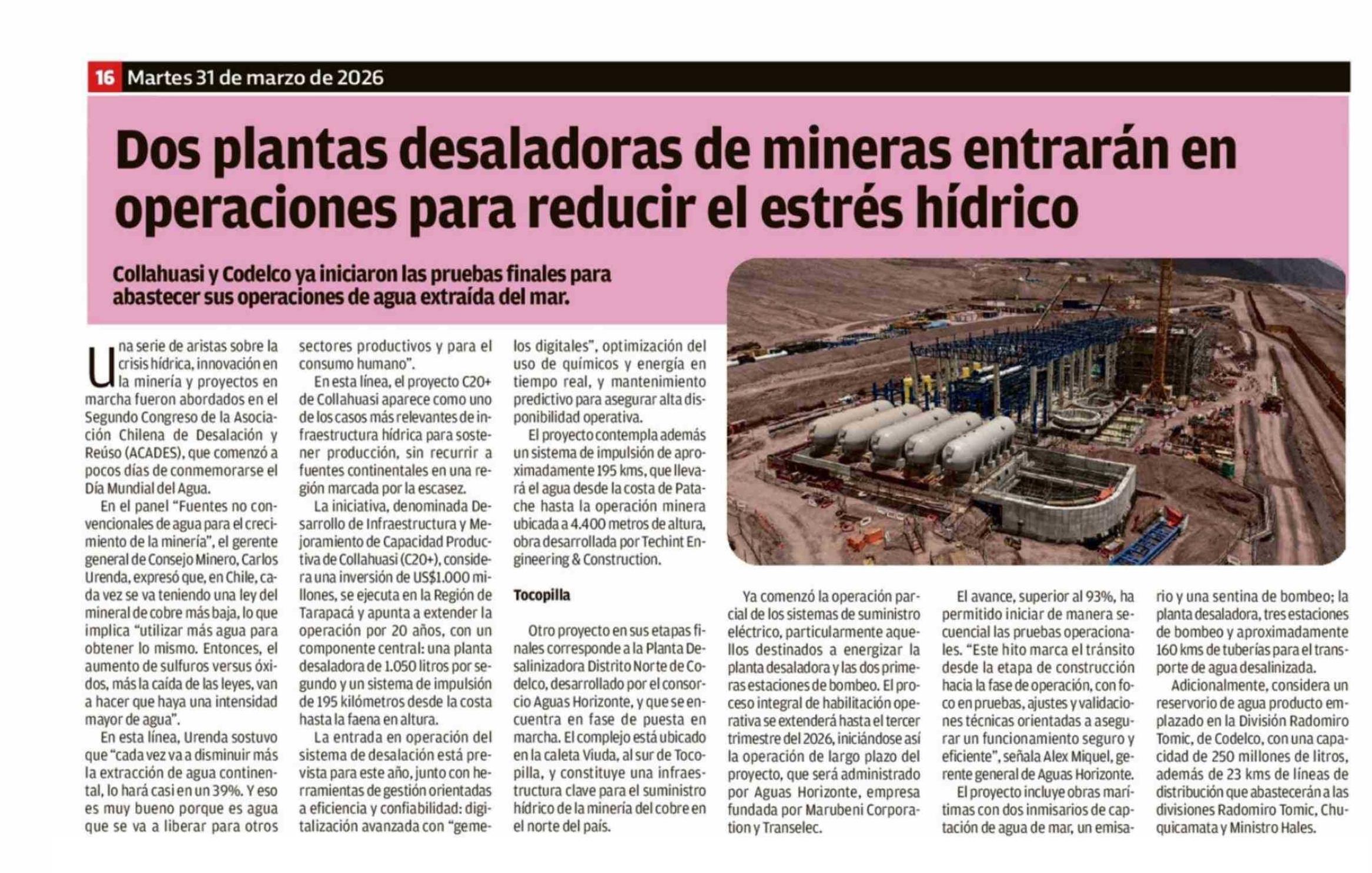 Título: Dos plantas desaladoras de mineras entrarán en operaciones para reducir el estrés hídrico