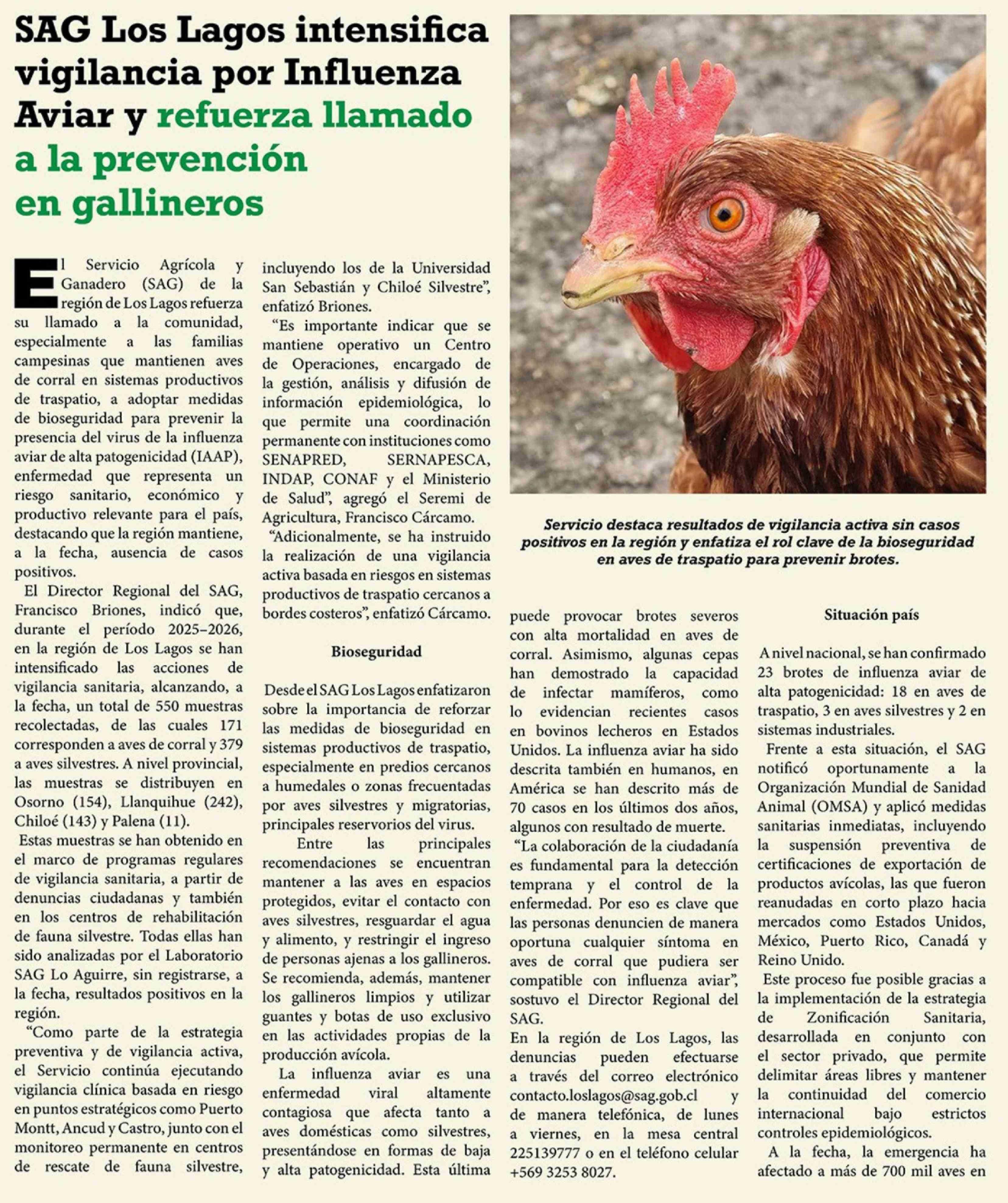 SAG Los Lagos intensifica vigilancia por Influenza Aviar y refuerza llamado a la prevención en gallineros 10-04-2026 El Heraldo Austral |