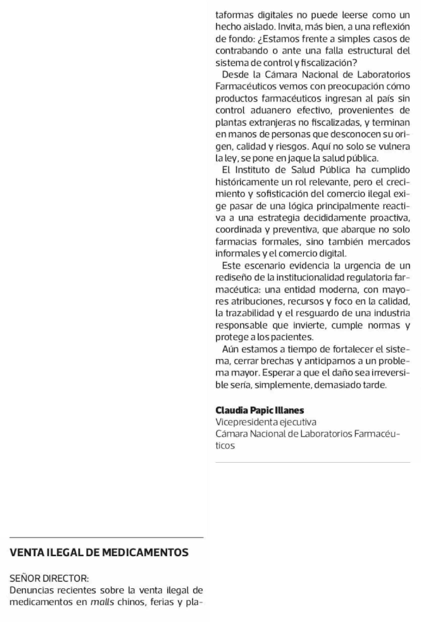 Cartas: VENTA ILEGAL DE MEDICAMENTOS 10-02-2026 La Tercera |