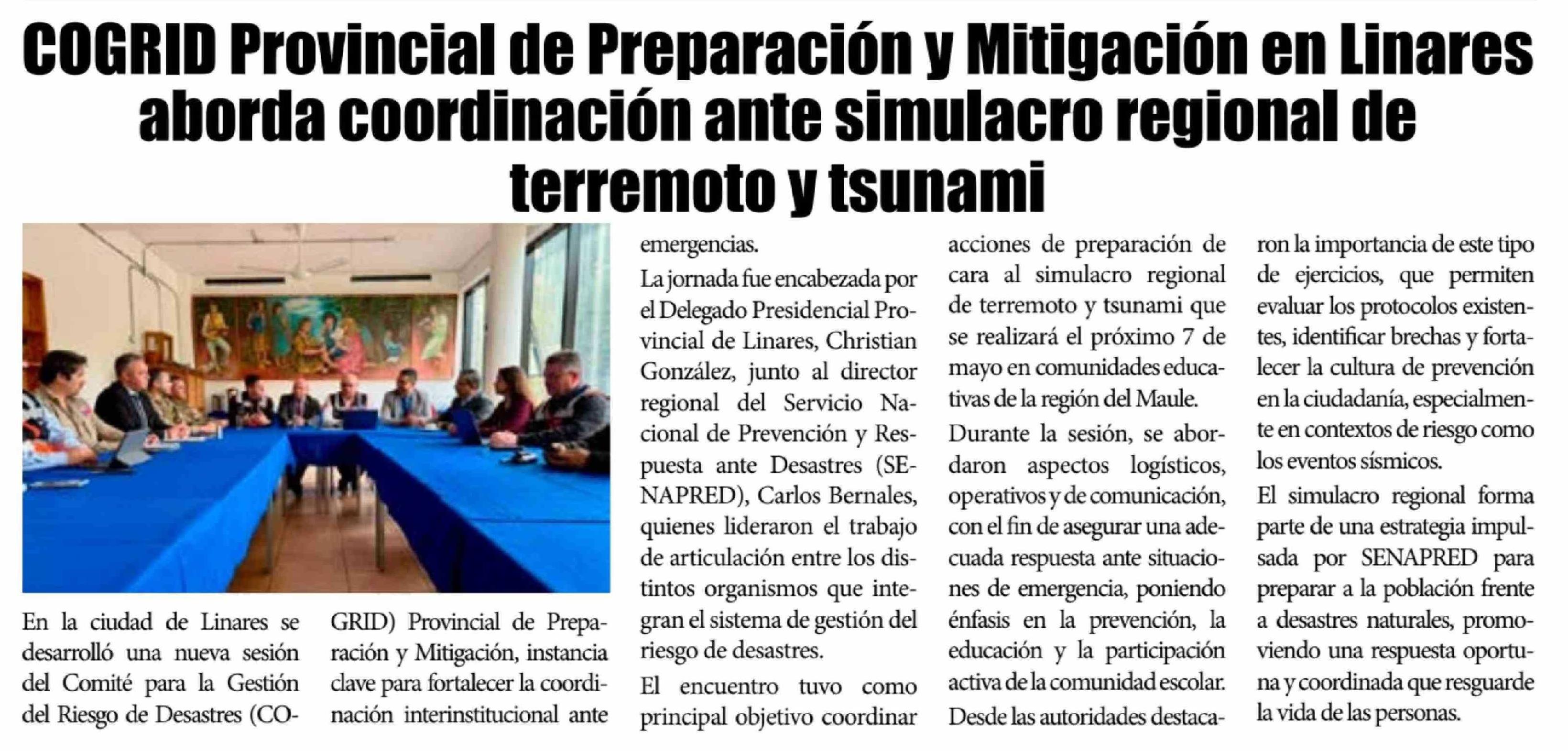 COGRID Provincial de Preparación y Mitigación en Linares aborda coordinación ante simulacro regional de terremoto y tsunami 18-04-2026 El Lector |
