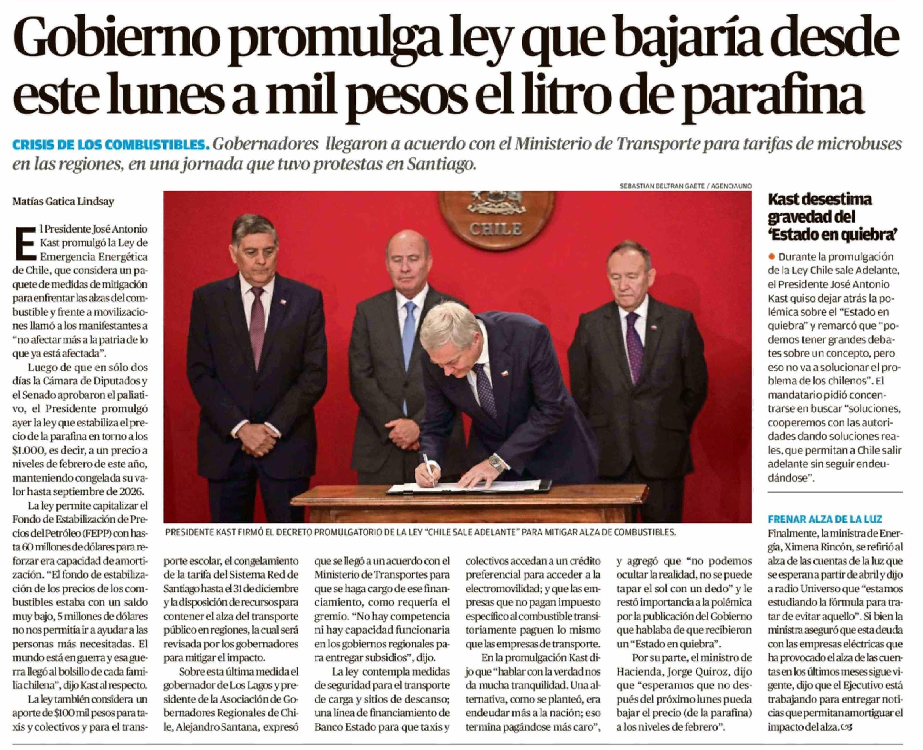 Gobierno promulga ley que bajaría desde este lunes a mil pesos el litro de parafina 27-03-2026 Diario Austral Región de Los Ríos |