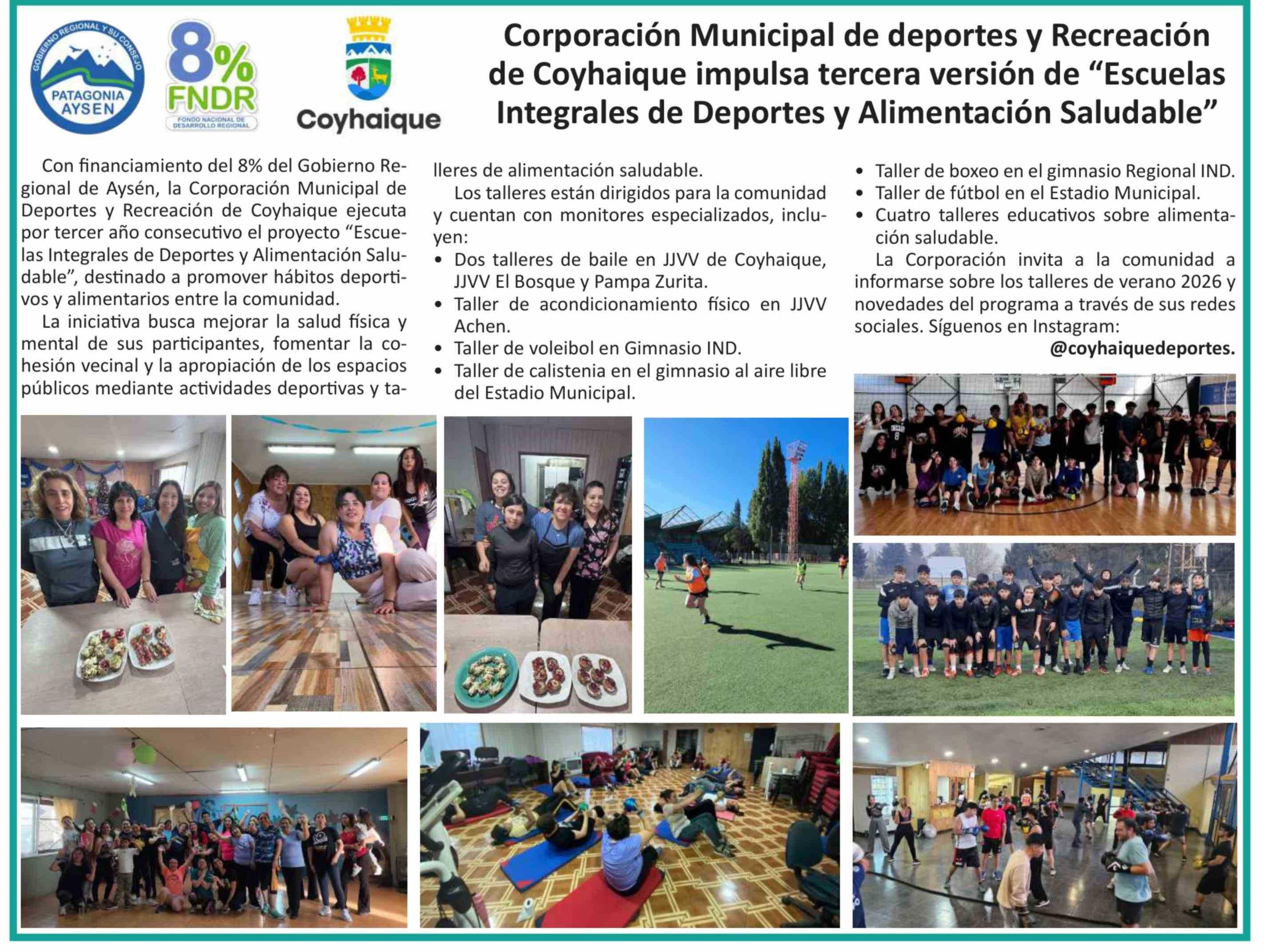 Corporación Municipal de deportes y Recreación de Coyhaique impulsa tercera versión de "Escuelas Integrales de Deportes y Alimentación Saludable" 06-02-2026 El Divisadero |