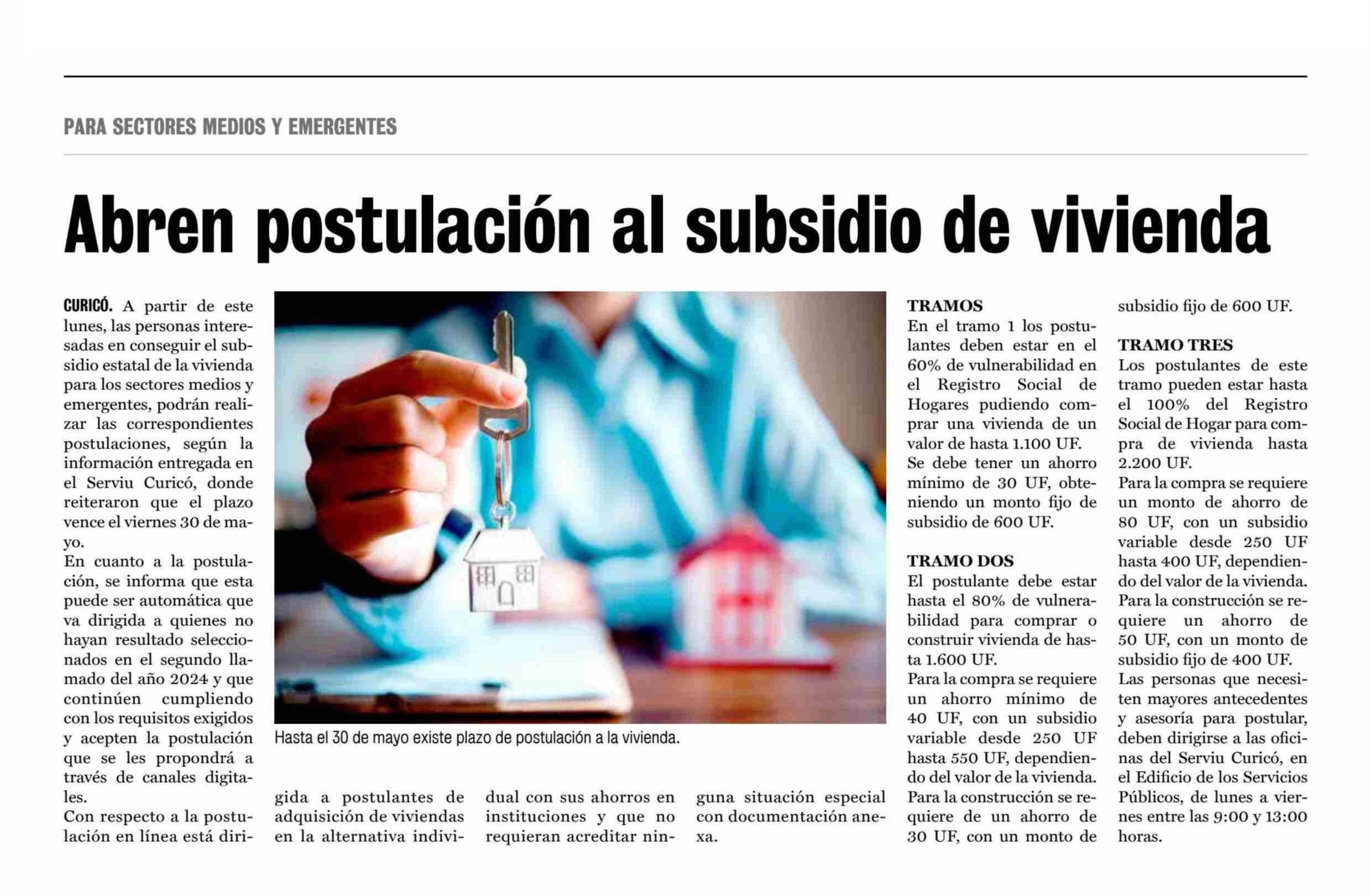 Abren postulación al subsidio de vivienda 20-05-2025 La Prensa de Curicó |