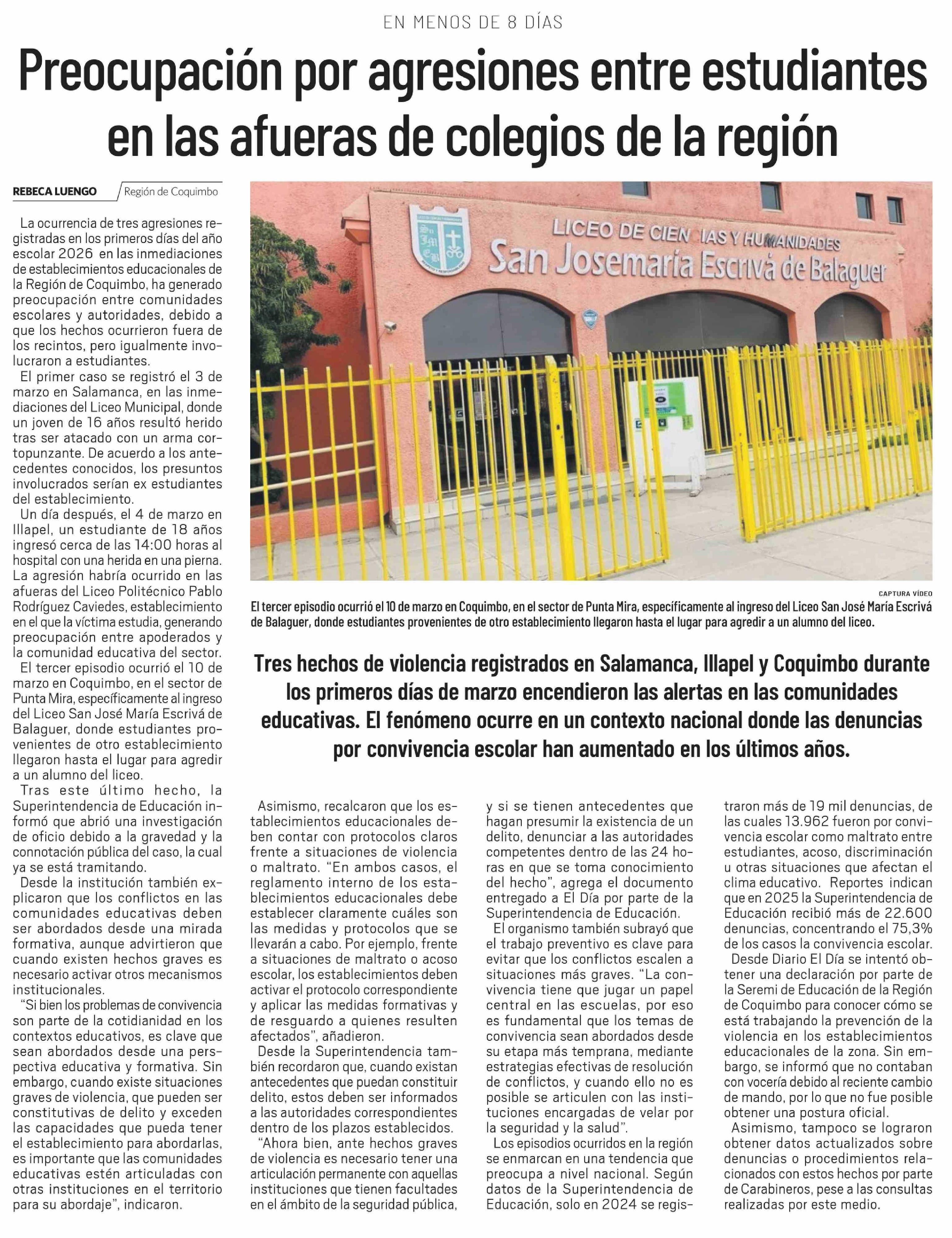 Preocupación por agresiones entre estudiantes en las afueras de colegios de la región 16-03-2026 El Día |