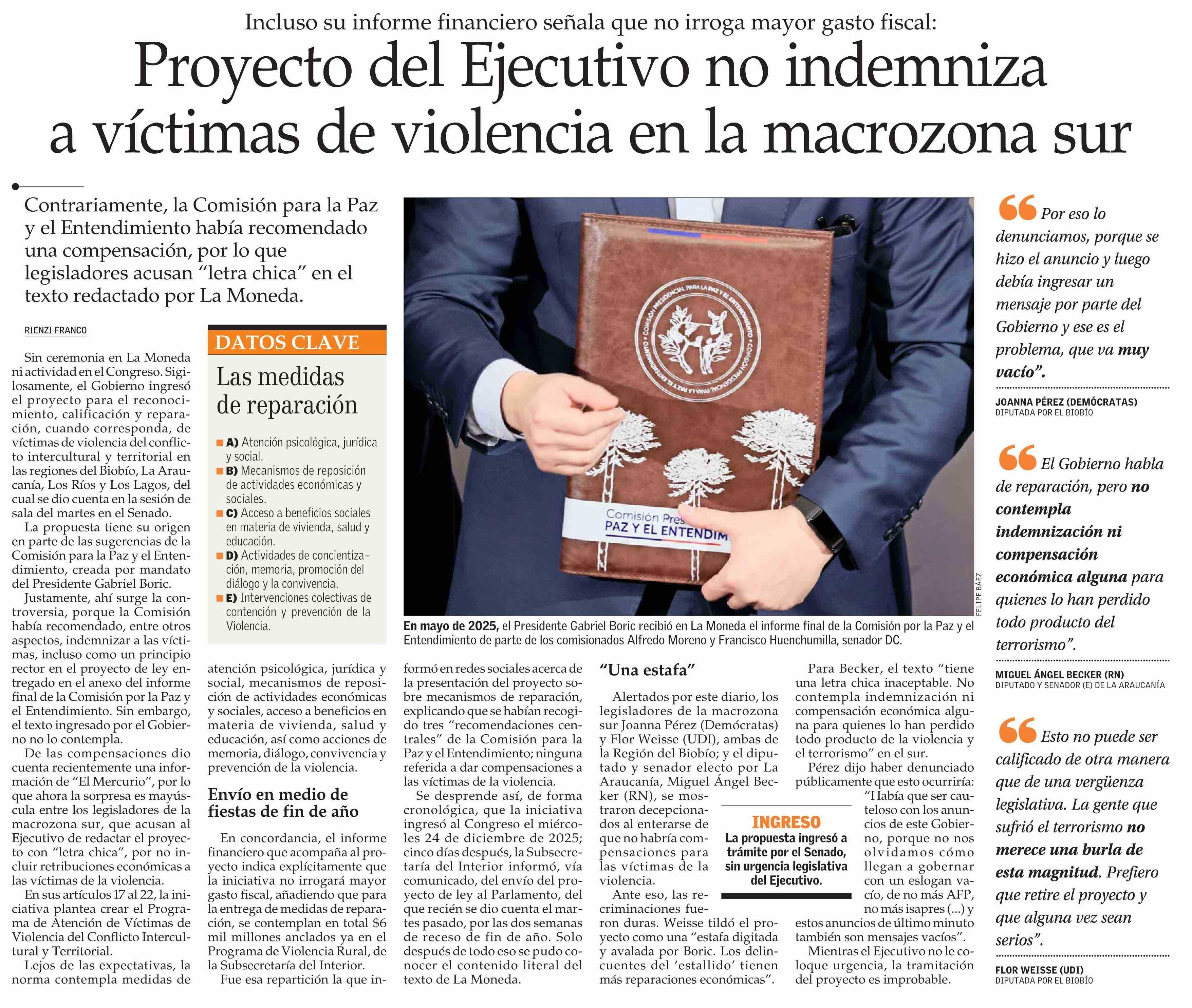 Título: Proyecto del Ejecutivo no indemniza a víctimas de violencia en la macrozona sur