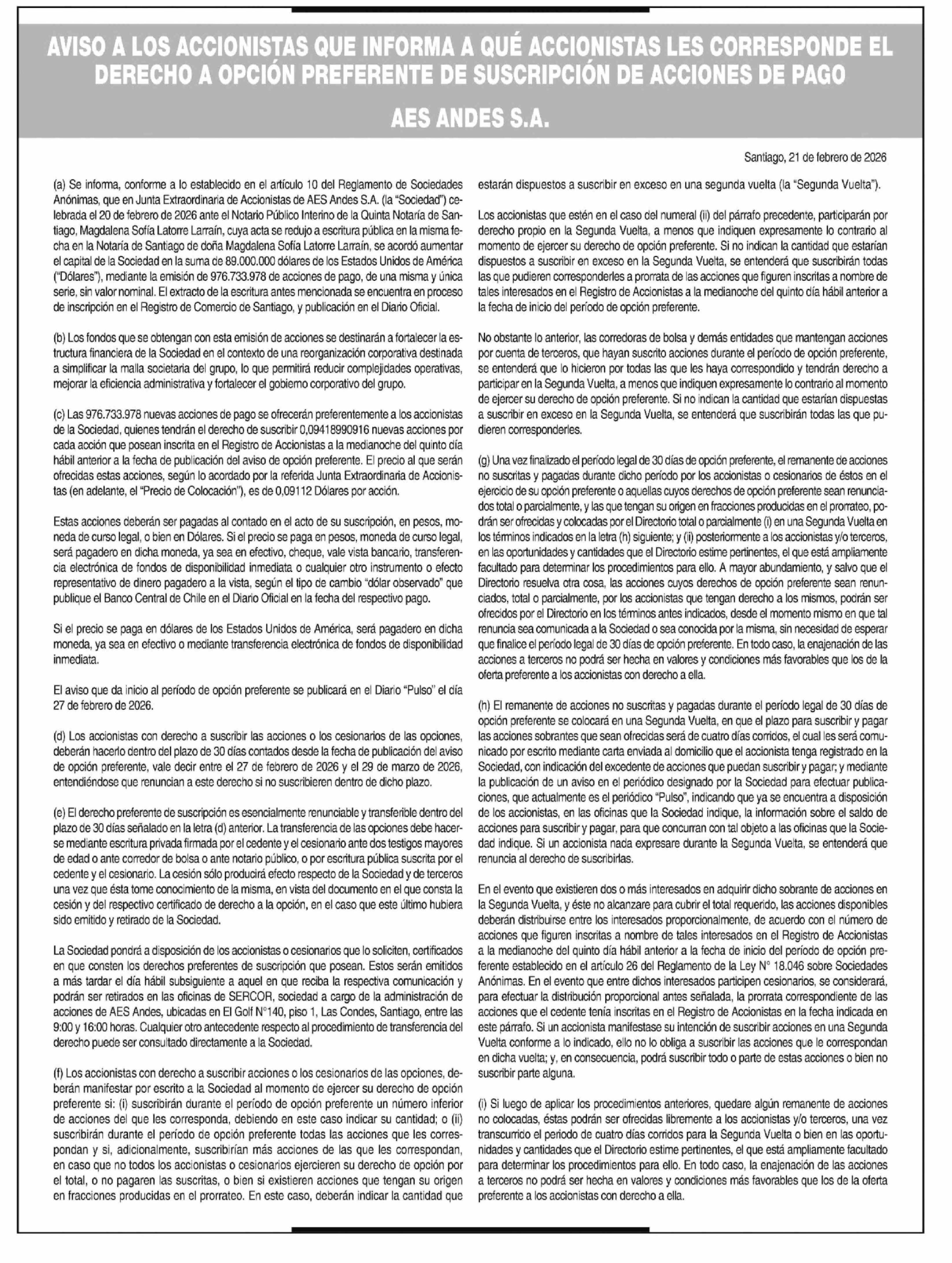Extractos: AVISO A LOS ACCIONISTAS QUE INFORMA A QUÉ ACCIONISTAS LES CORRESPONDE EL DERECHO A OPCIÓN PREFERENTE DE SUSCRIPCIÓN DE ACCIONES DE PAGO 21-02-2026 La Tercera |