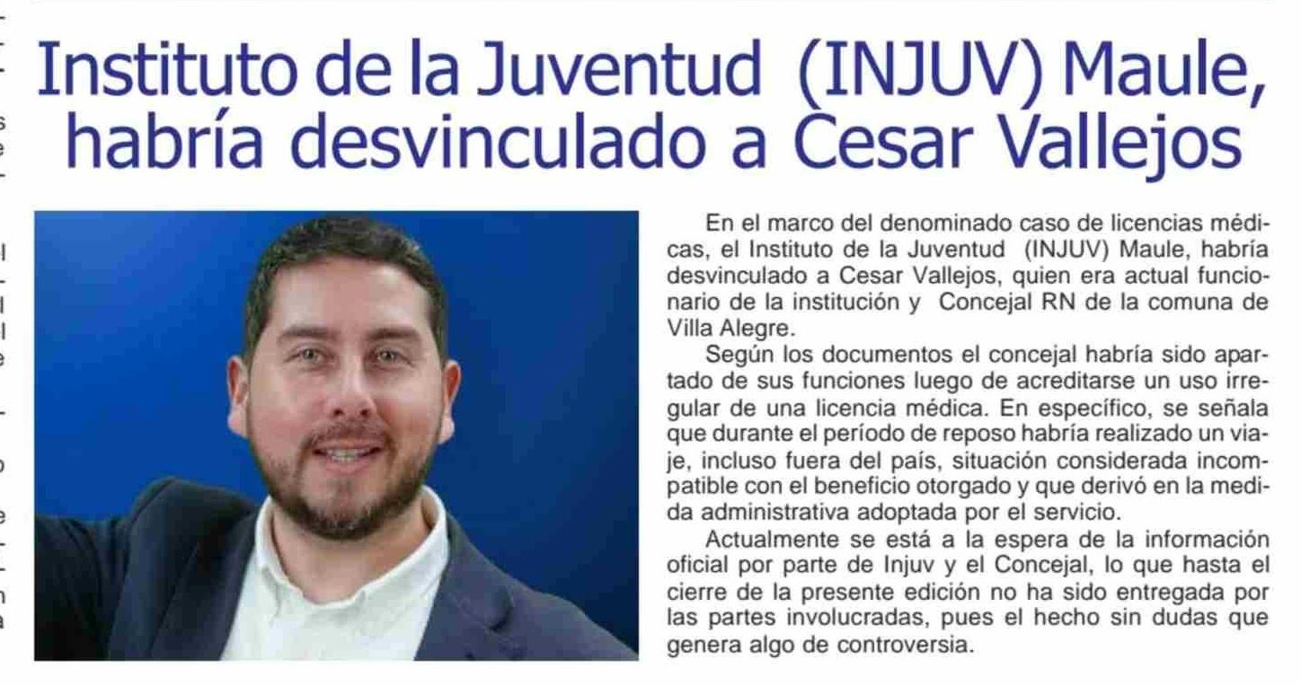 Título: Instituto de la Juventud (INJUV) Maule, habría desvinculado a Cesar Vallejos