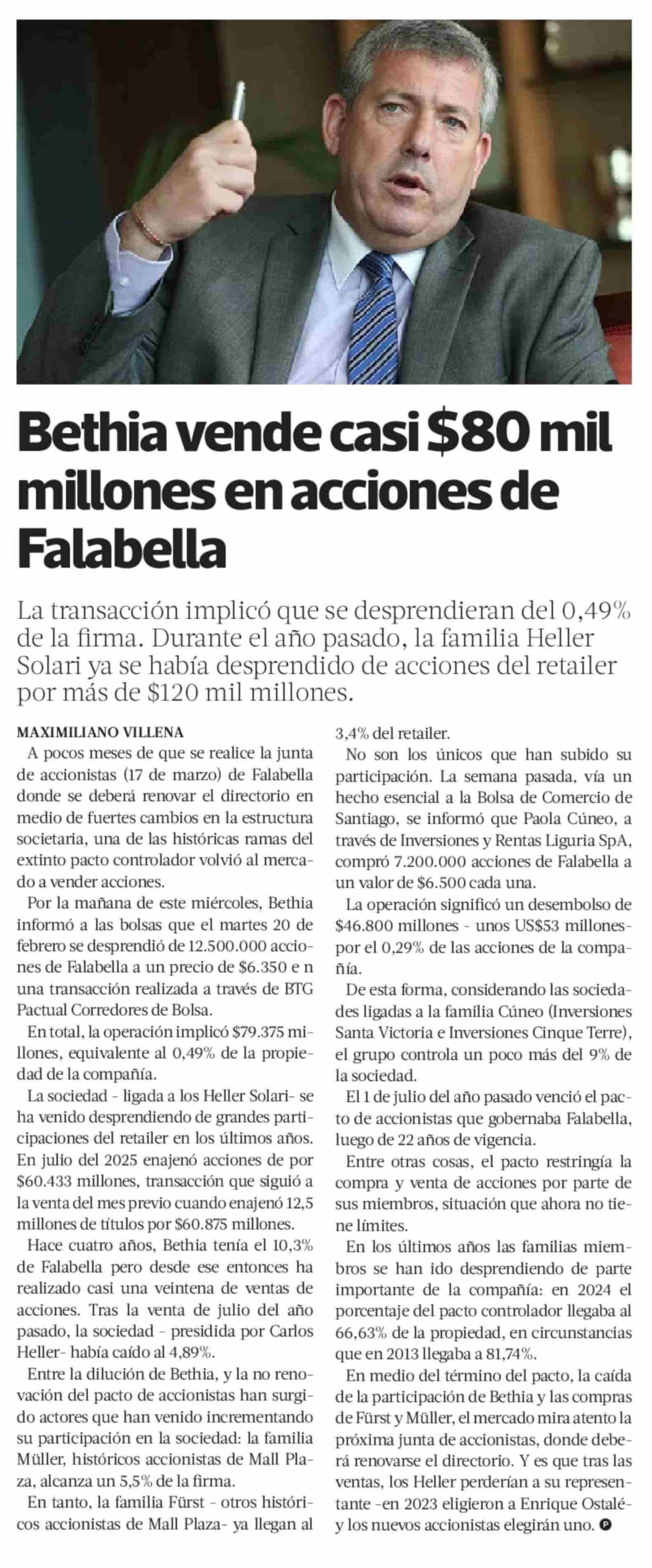 Bethia vende casi $80 mil millones en acciones de Falabella 22-01-2026 La Tercera |
