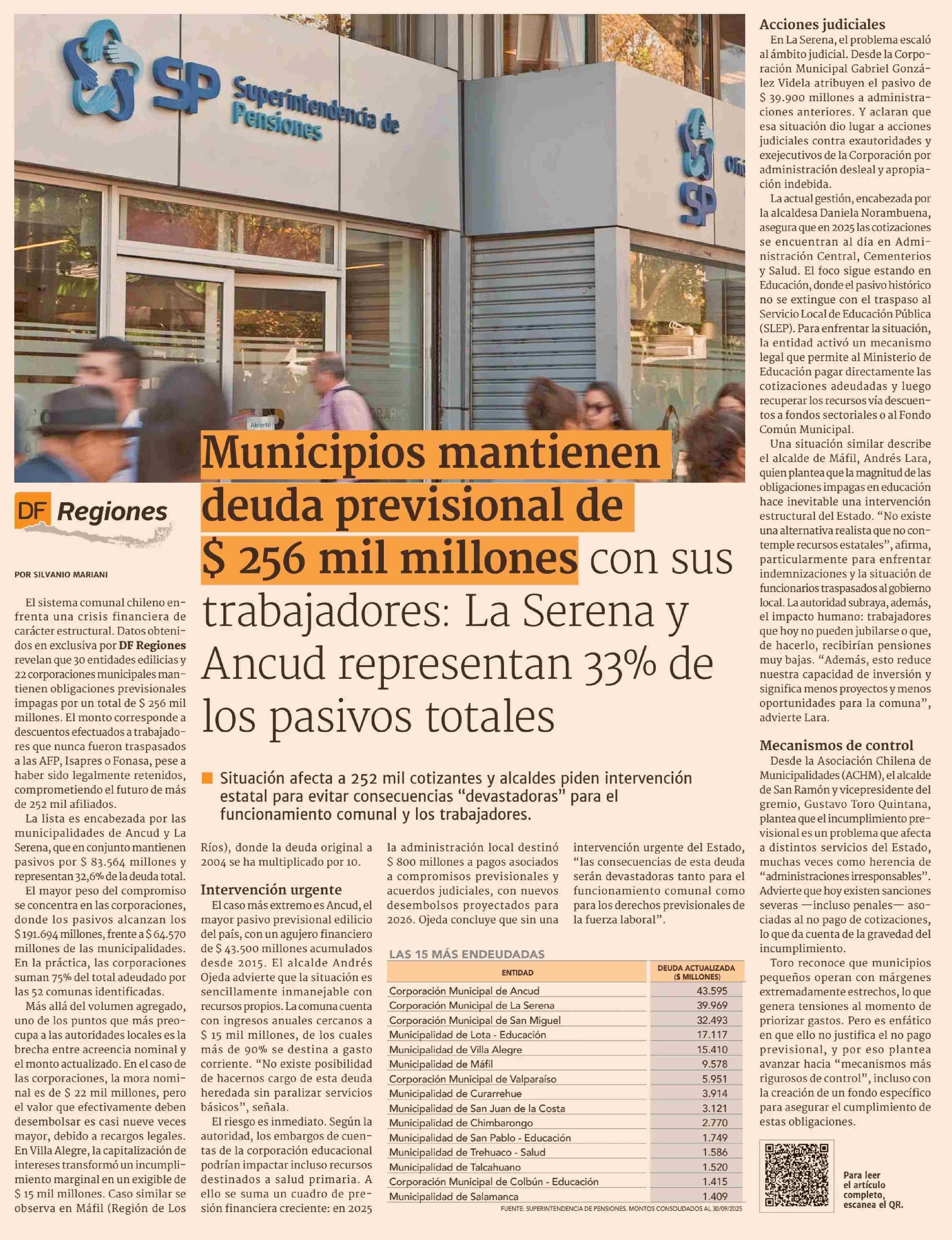 Municipios mantienen deuda previsional de $ 256 mil millones con sus trabajadores: La Serena y Ancud representan 33% de los pasivos totales 28-01-2026 Diario Financiero |