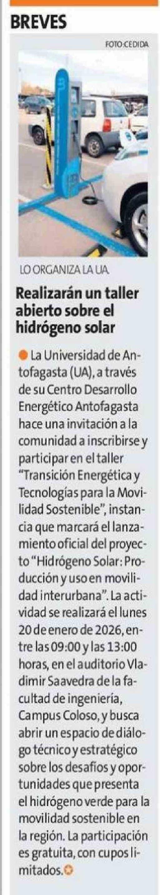 Realizarán un taller abierto sobre el hidrógeno solar 14-01-2026 La Estrella de Antofagasta |
