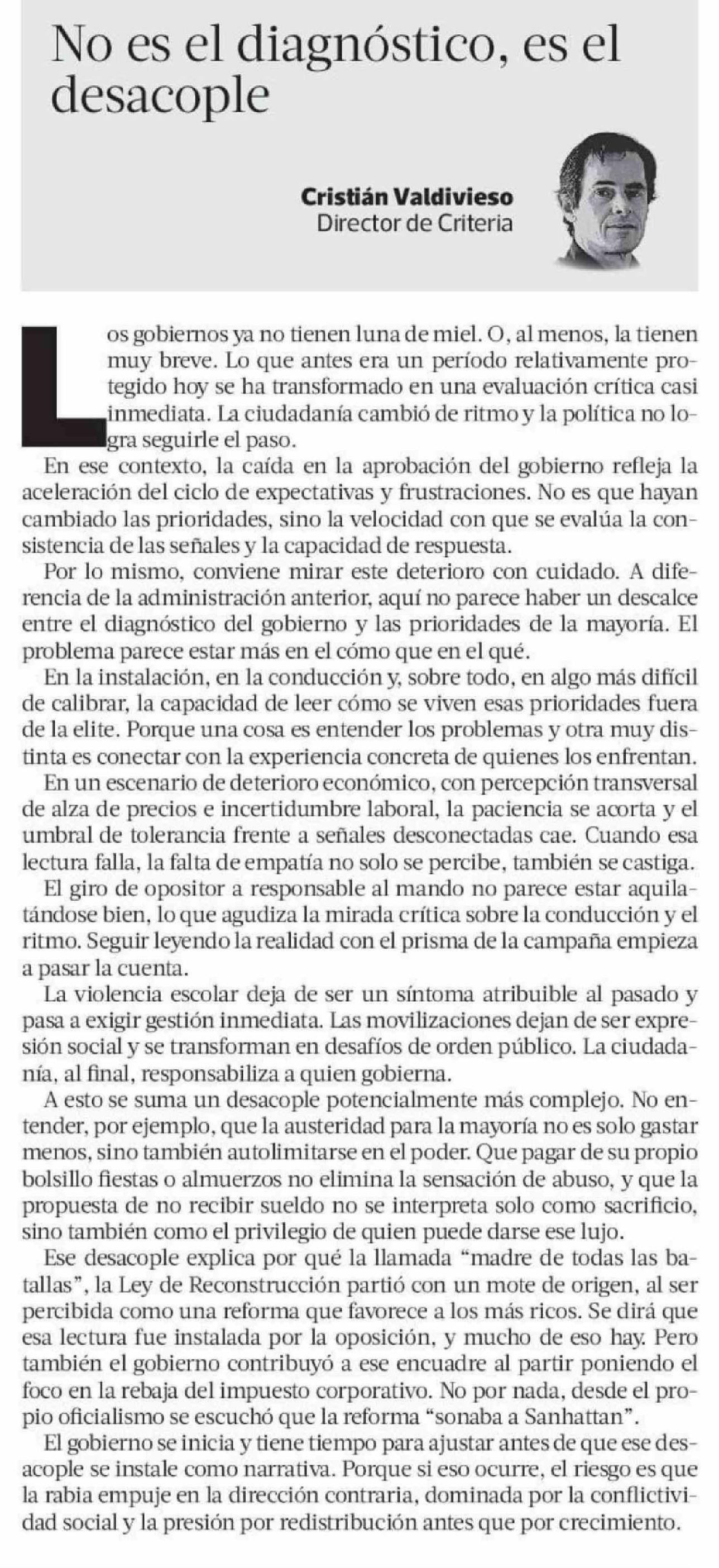 Columnas de Opinión: No es el diagnóstico, es el desacople 18-04-2026 La Tercera |