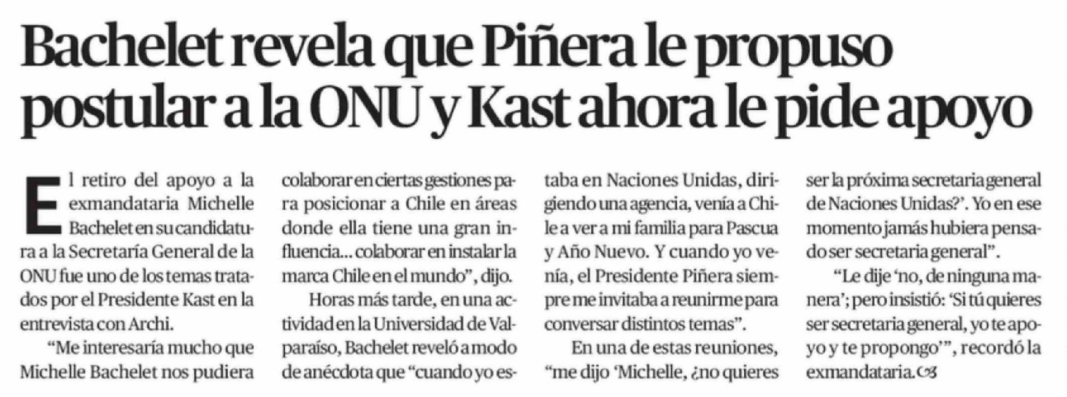 Título: Bachelet revela que Piñera le propuso postular a la ONU y Kast ahora le pide apoyo