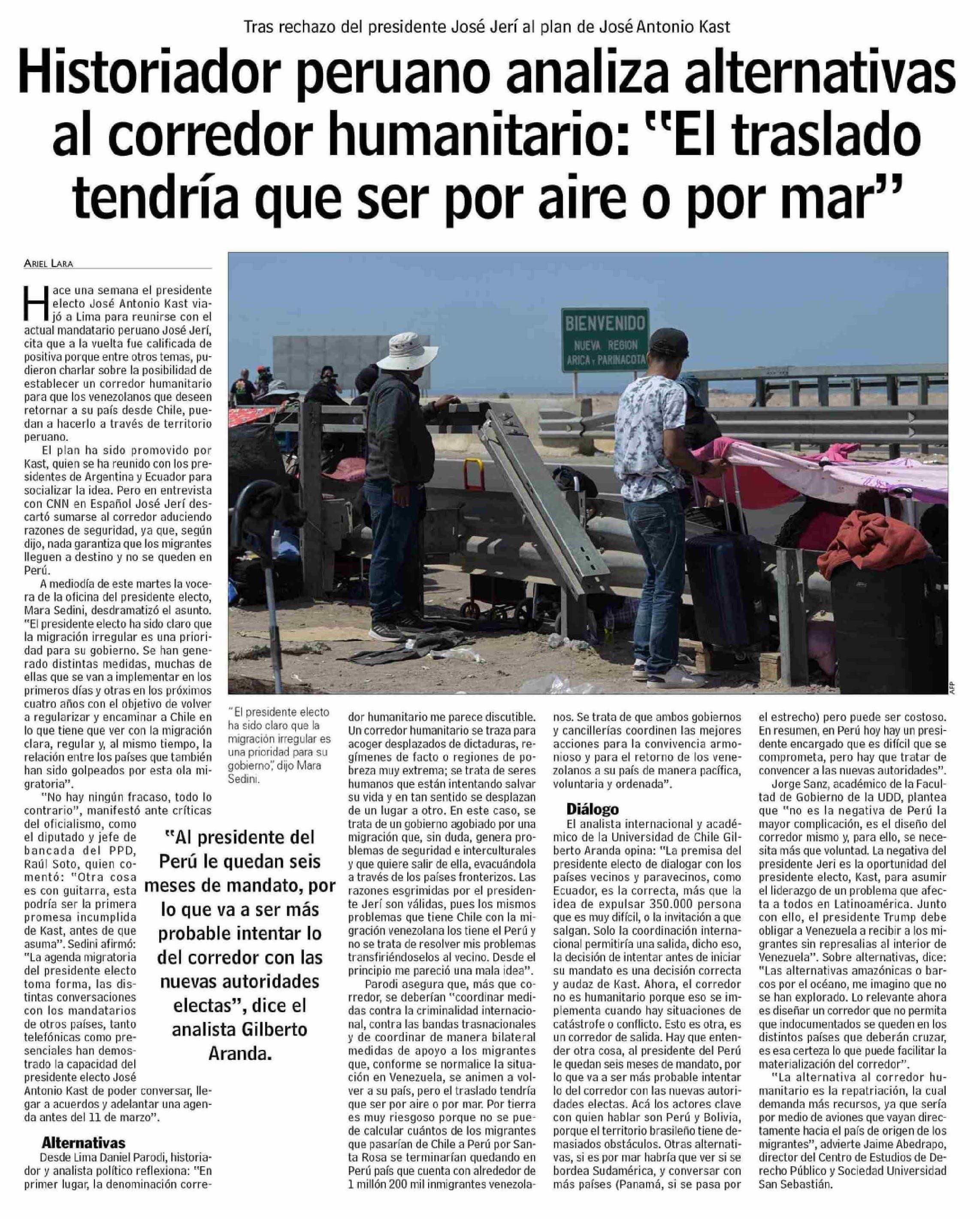 Historiador peruano analiza alternativas al corredor humanitario: "El traslado tendría que ser por aire o por mar" 14-01-2026 Las Últimas Noticias |