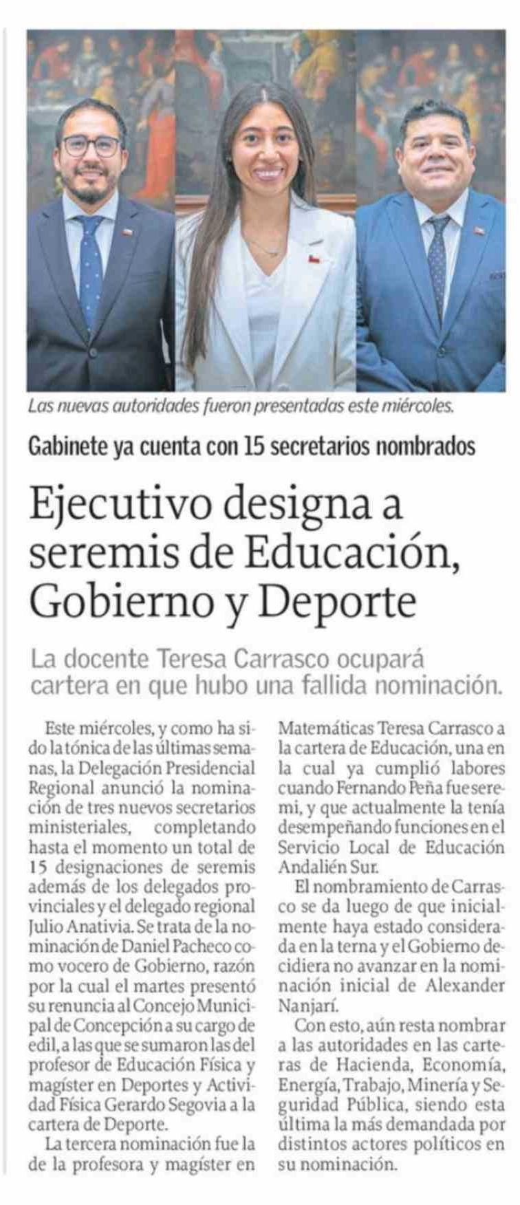 Ejecutivo designa a seremis de Educación, Gobierno y Deporte 02-04-2026 El Sur |
