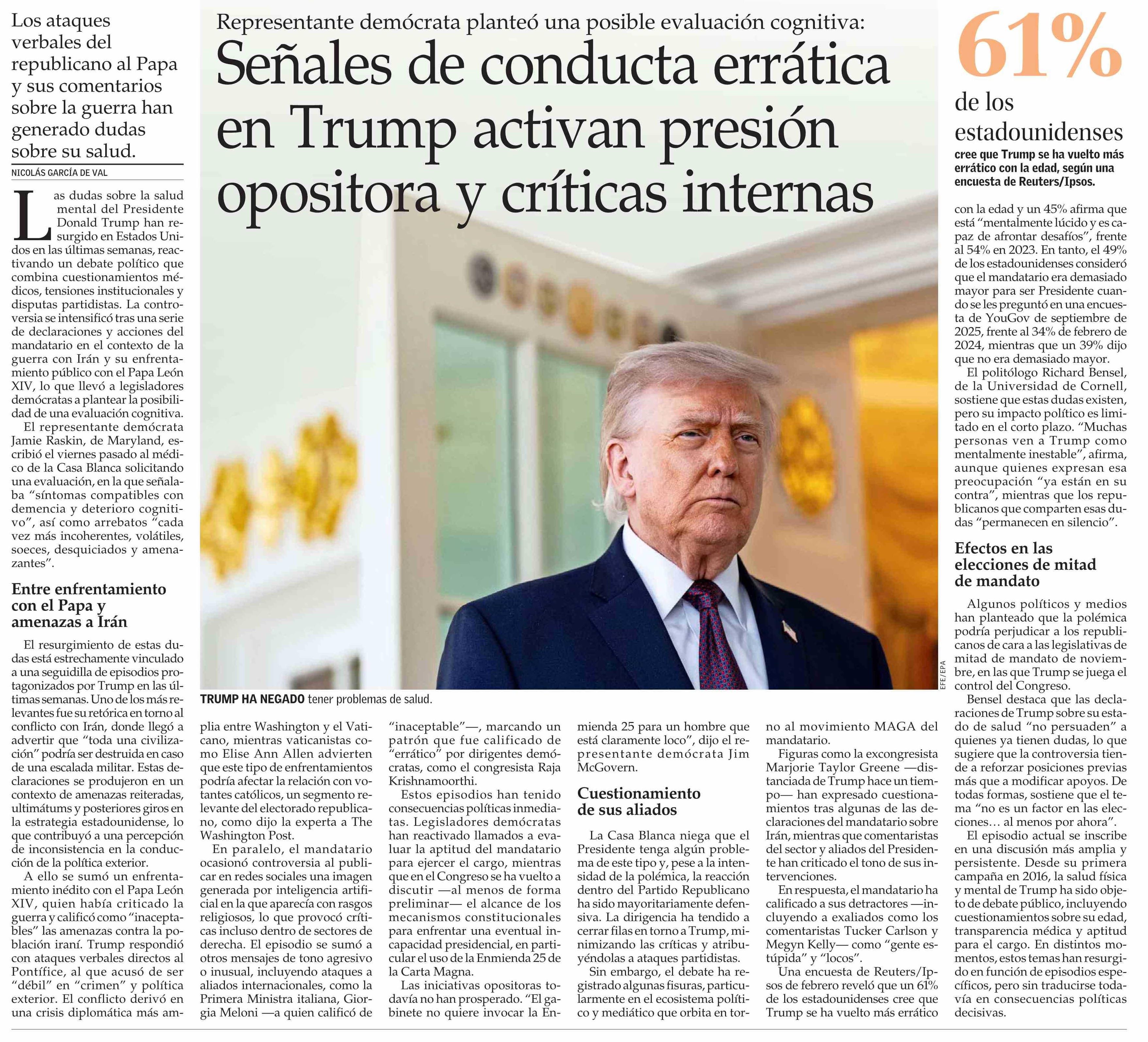 Señales de conducta errática en Trump activan presión opositora y críticas internas 16-04-2026 El Mercurio |