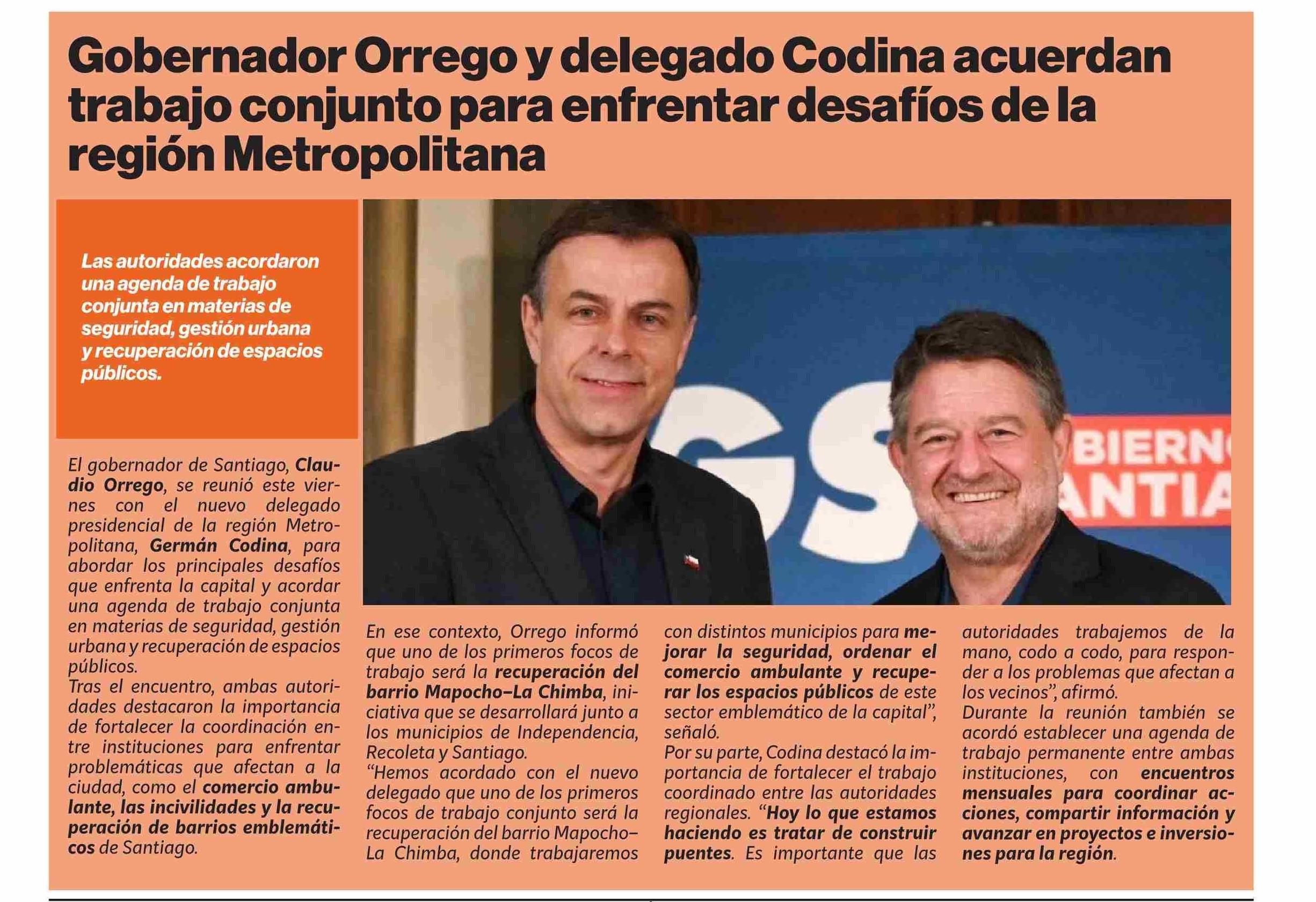 | Título: | Gobernador Orrego y delegado Codina acuerdan trabajo conjunto para enfrentar desafíos de la región Metropolitana |