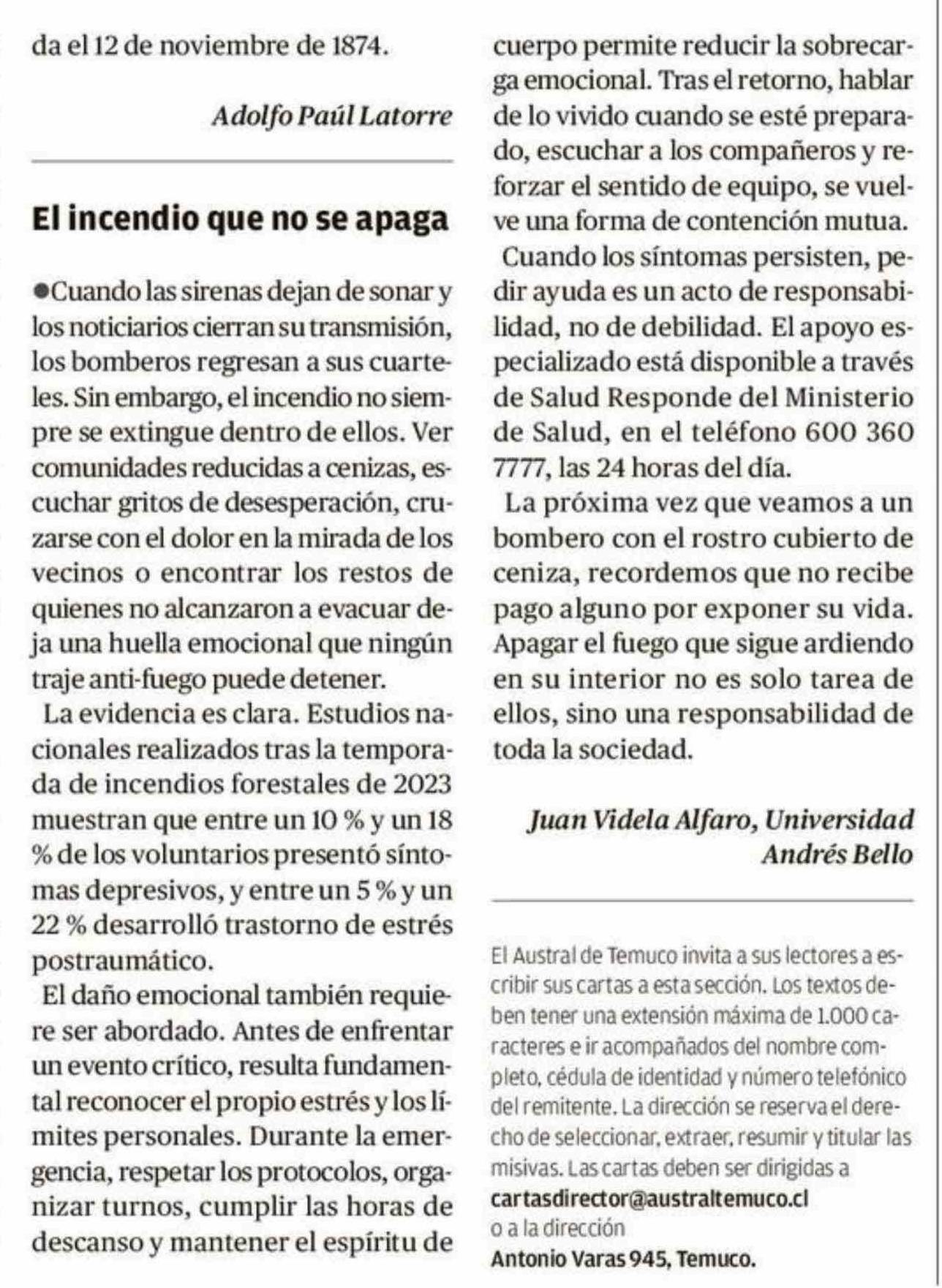 Cartas: El incendio que no se apaga 23-01-2026 El Austral de la Araucanía |