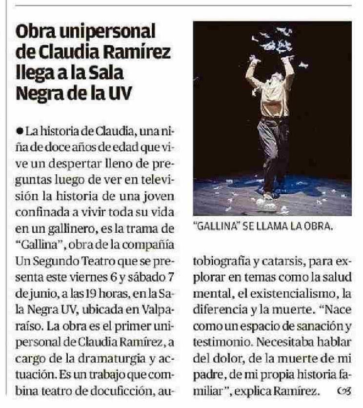 Obra unipersonal de Claudia Ramirez llega ala Sala Negra de la UV 05-06-2025 El Mercurio de Valparaíso |