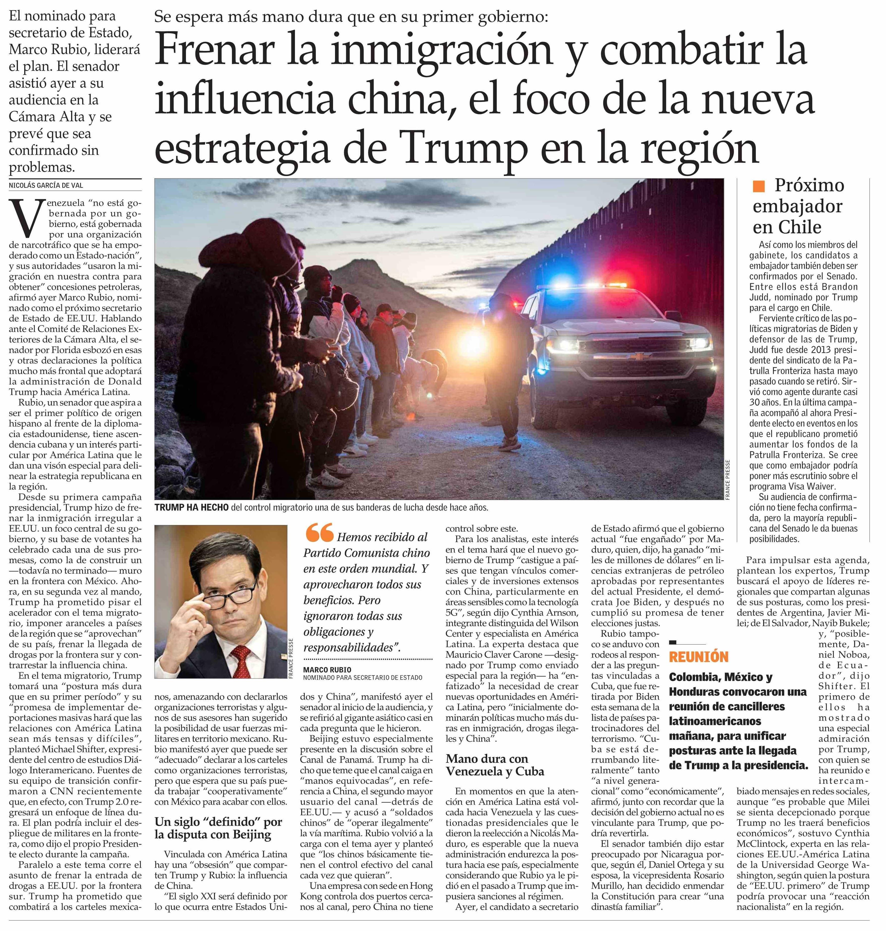 Frenar la inmigración y combatir la influencia china, el foco de la nueva estrategia de Trump en la región 16-01-2025 El Mercurio |