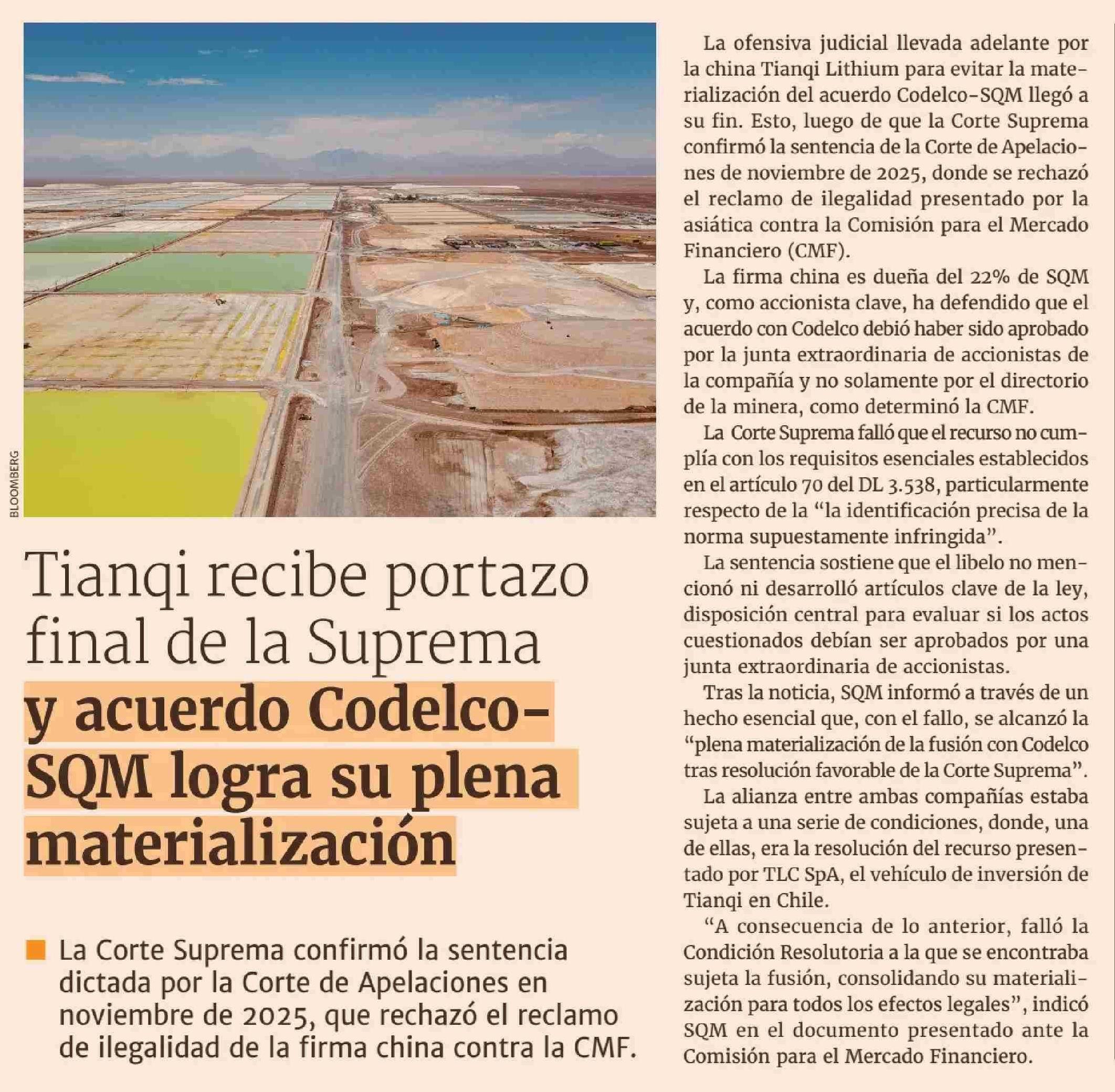 Título: Tianqi recibe portazo final de la Suprema y acuerdo CodelcoSQM logra su plena materialización