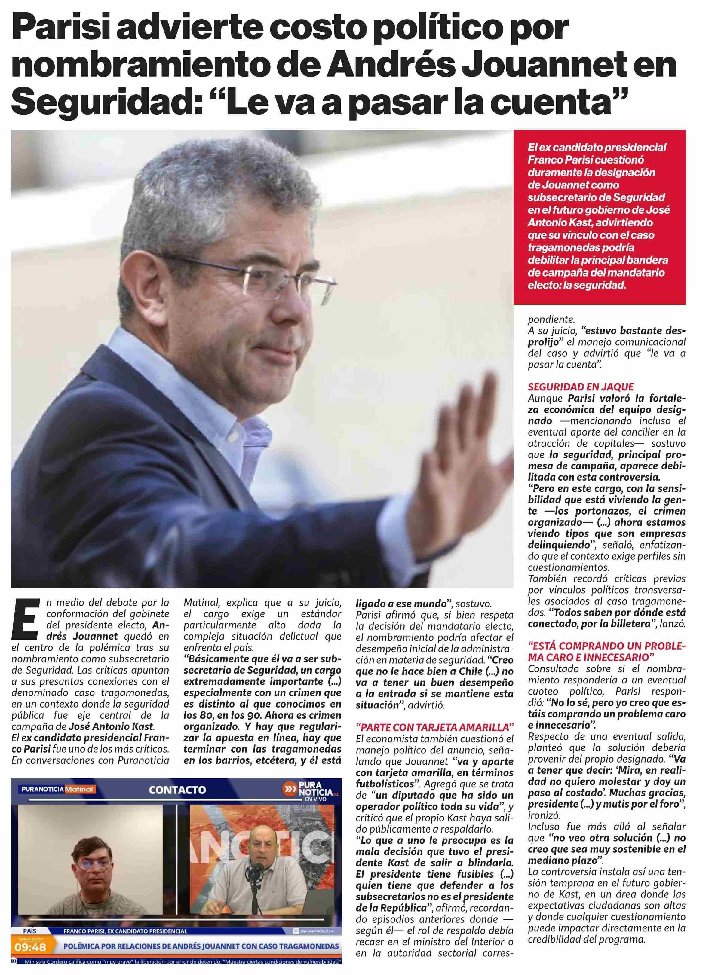 Título: Parisi advierte costo político por nombramiento de Andrés Jouannet en Seguridad: “Le va a pasar la cuenta”