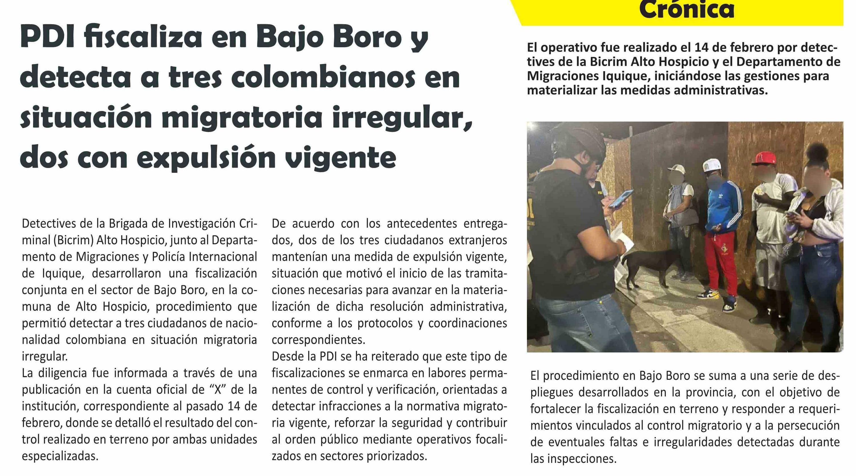 PDI fiscaliza en Bajo Boro y detecta a tres colombianos en situación migratoria irregular, dos con expulsión vigente 16-02-2026 El Longino |