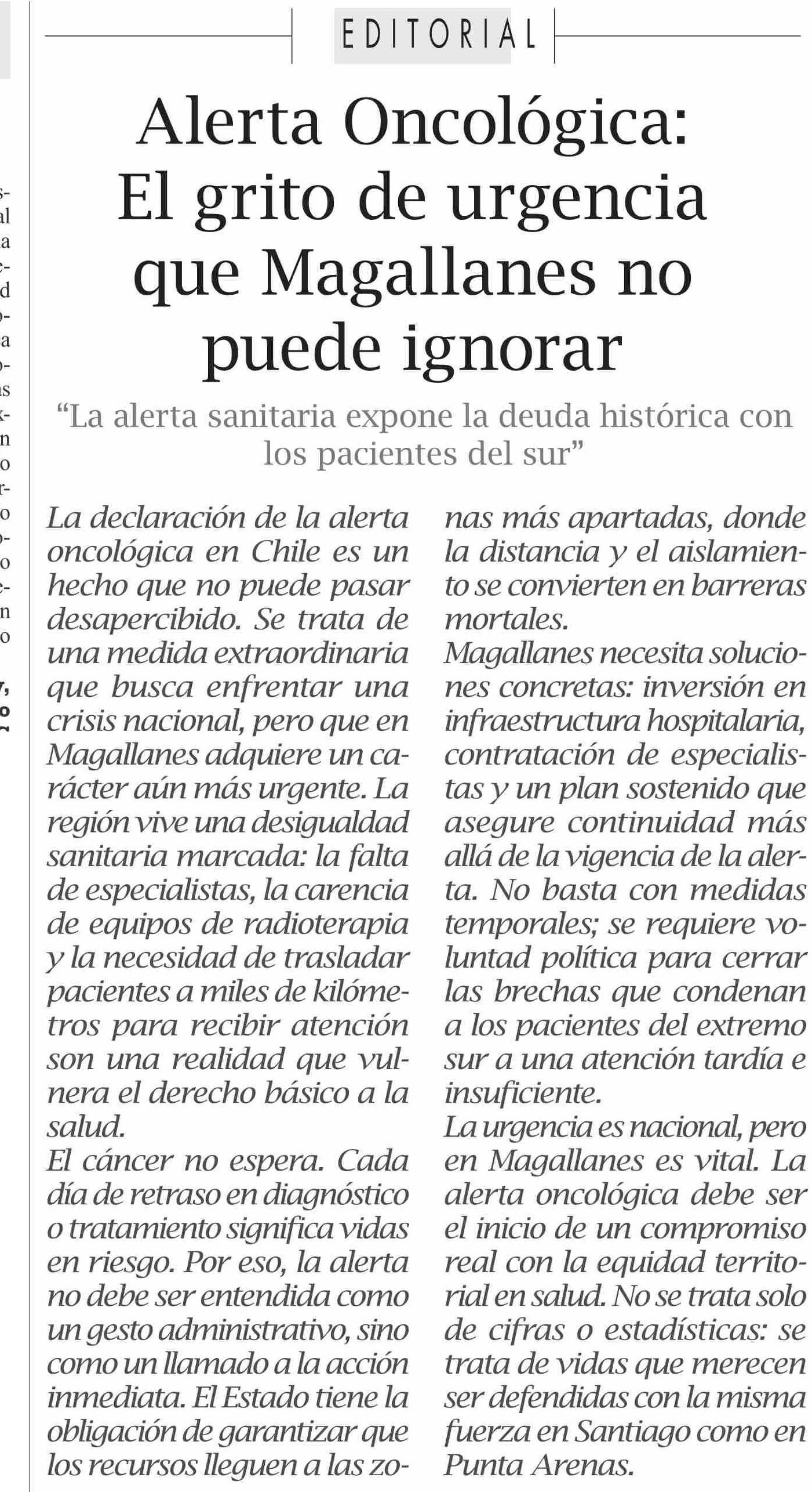Título: EDITORIAL: Alerta Oncológica: El grito de urgencia que Magallanes no puede ionarar
