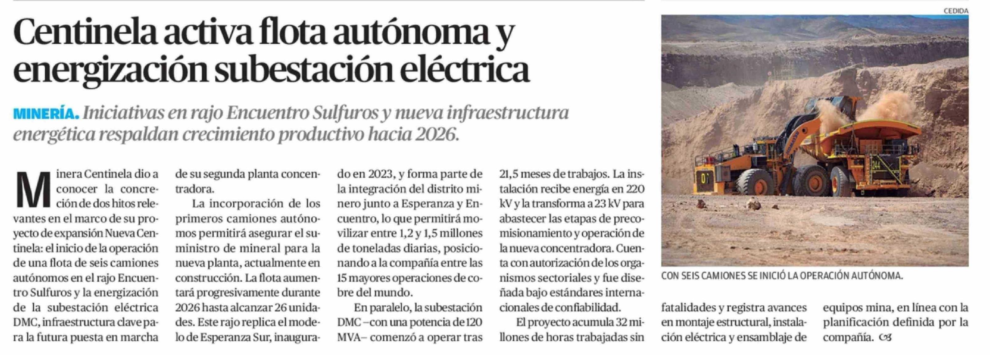 Centinela activa flota autónoma y energización subestación eléctrica 12-02-2026 El Mercurio de Antofagasta |