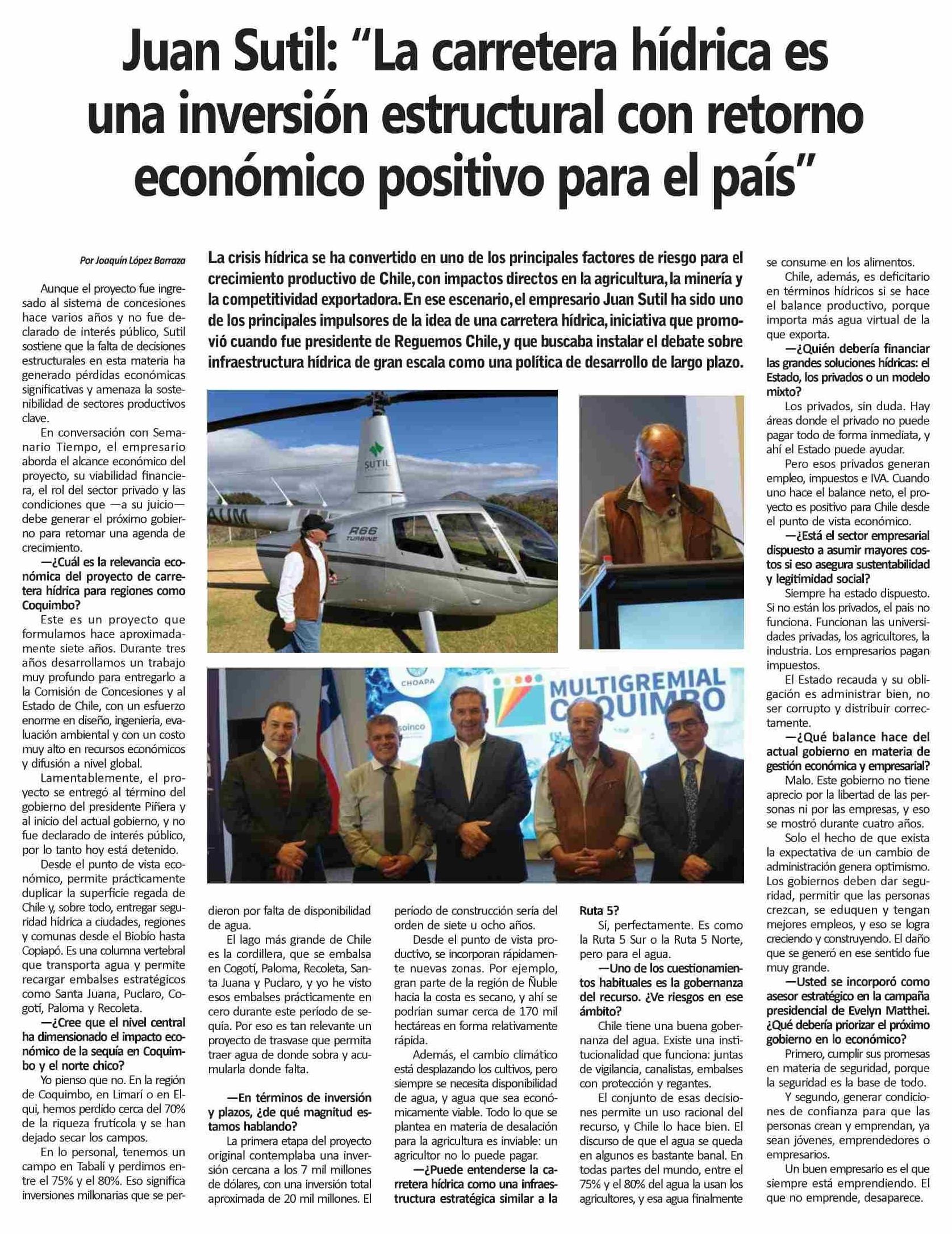 Juan Sutil: "La carretera hídrica es una inversión estructural con retorno económico positivo para el país" 09-01-2026 Semanario Tiempo |