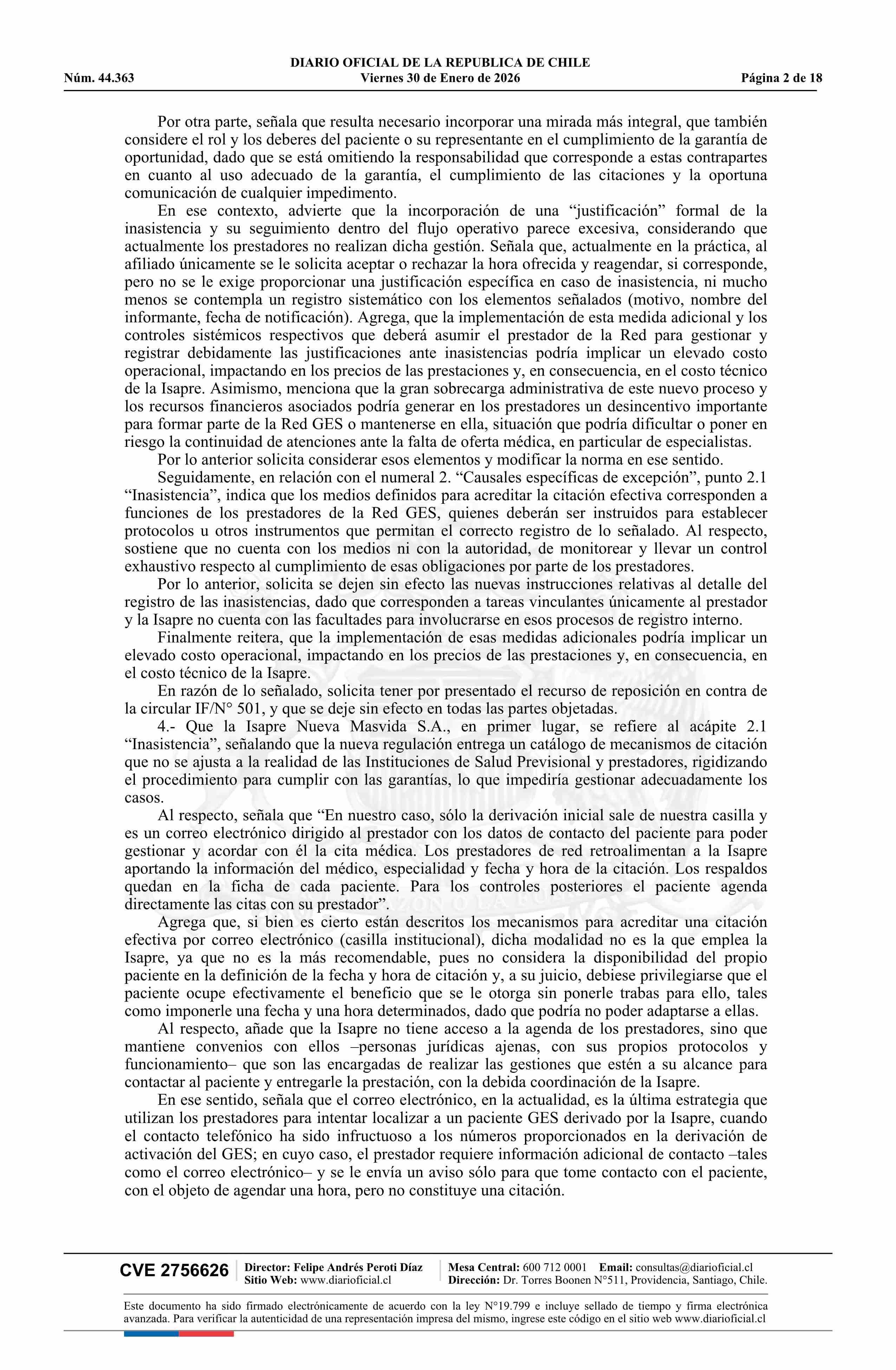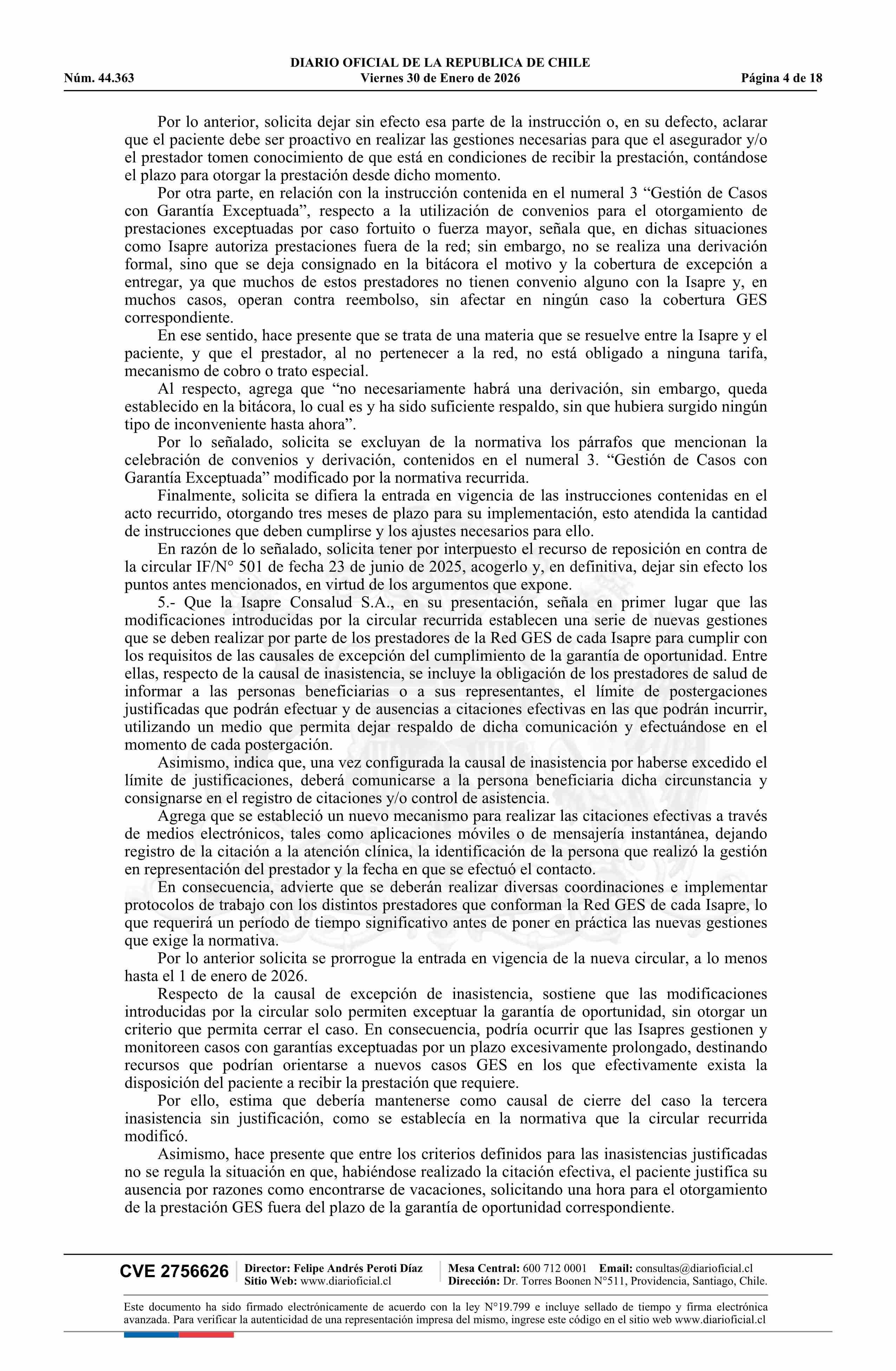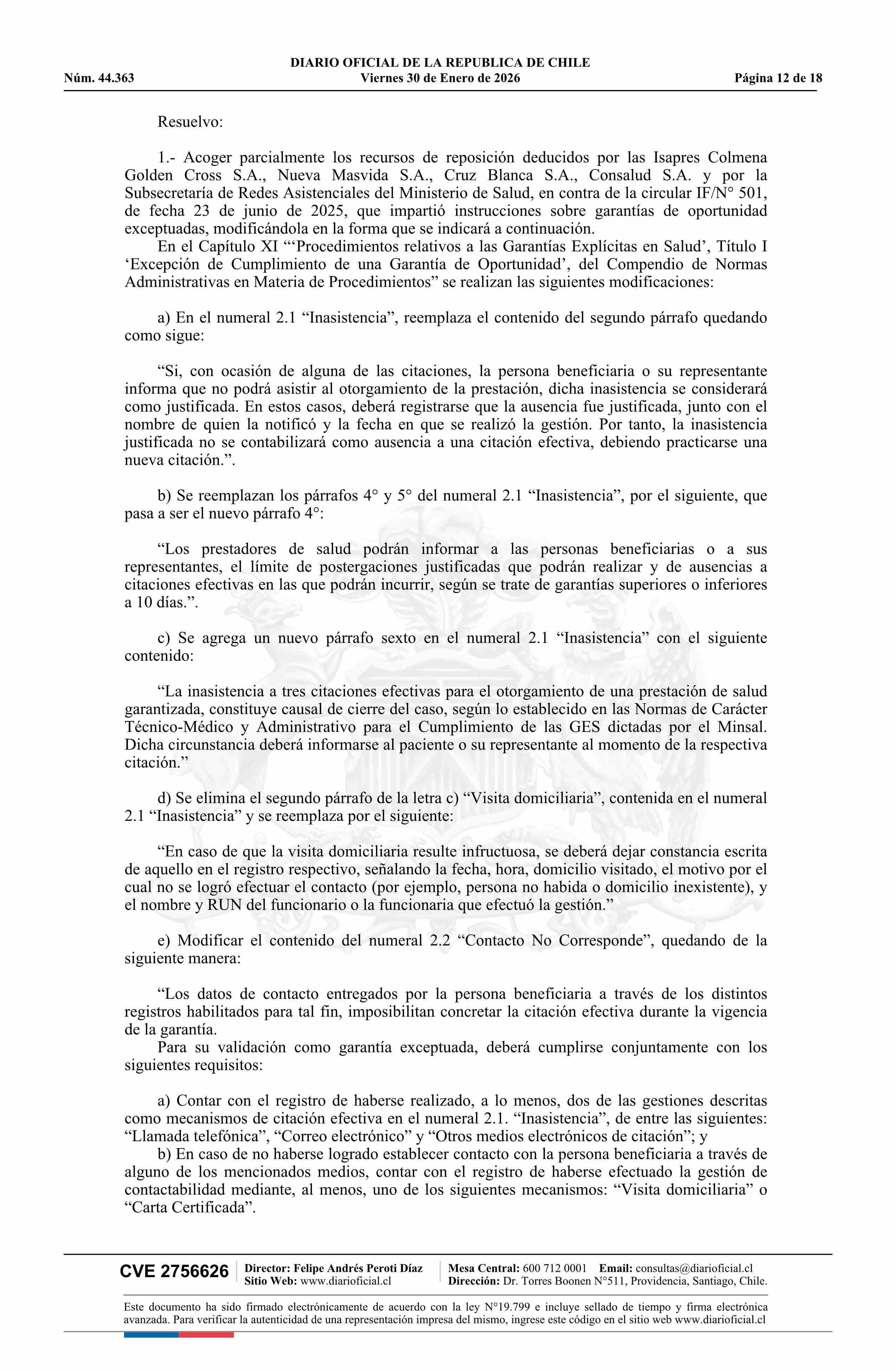 | Título: | Resolución exenta número IF 444, de 2026.- Acoge parcialmente los recursos de reposición deducidos por las isapres Colmena Golden Cross S.A., Nueva Masvida S.A., Cruz Blanca S.A. y Consalud S.A., y por la Subsecretaría de Redes Asistenciales, en contra de la circular IF/N° 501 de 2025 |