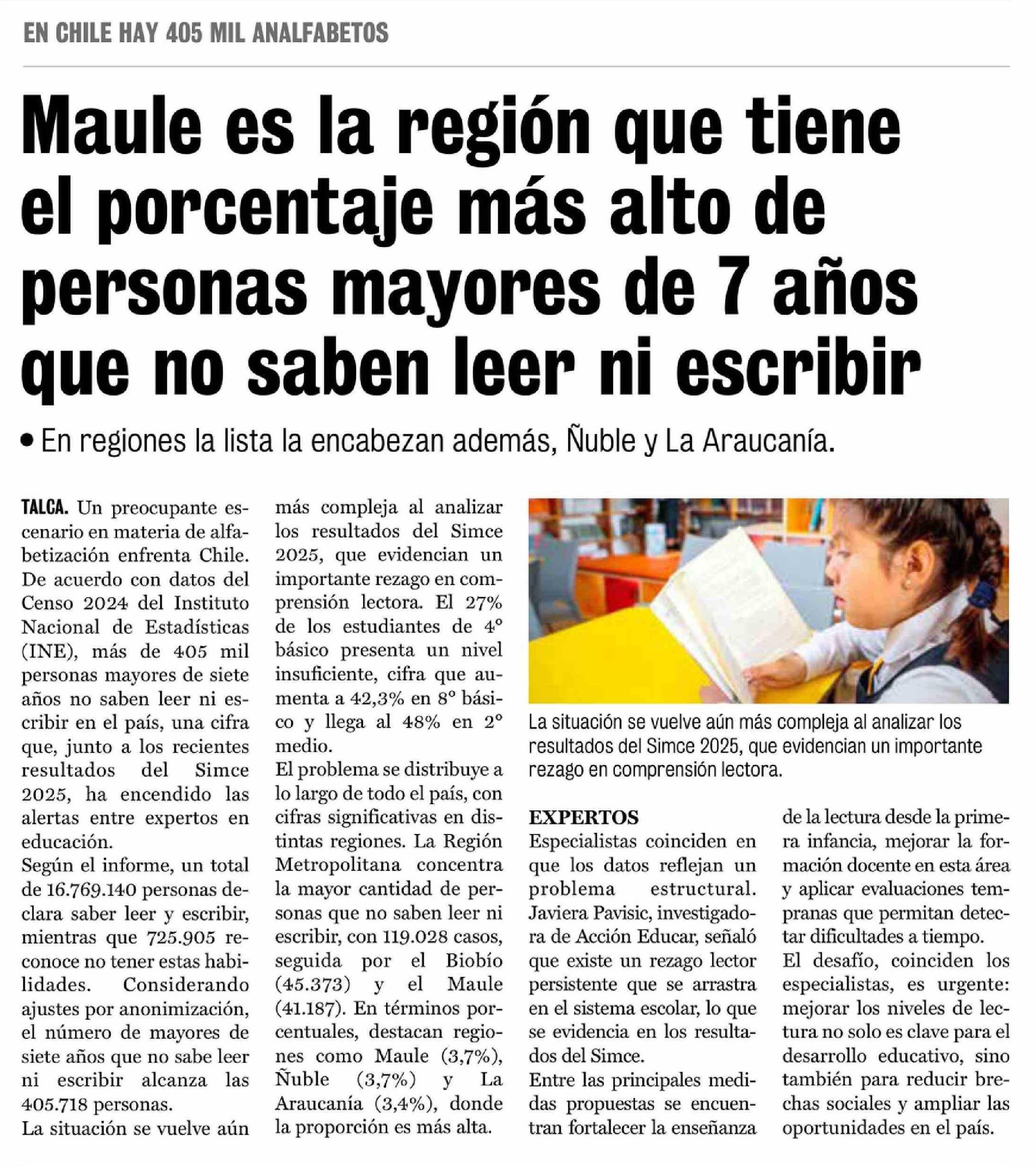| Título: | Maule es la región que tiene el porcentaje más alto de personas mayores de 7 años que no saben leer ni escribir |