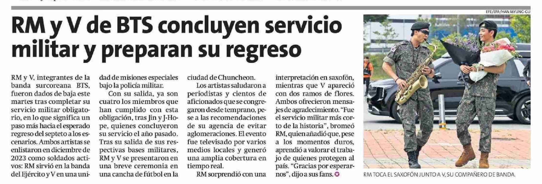 RM y V de BTS concluyen servicio militar y preparan su regreso 11-06-2025 La Estrella de Concepción |