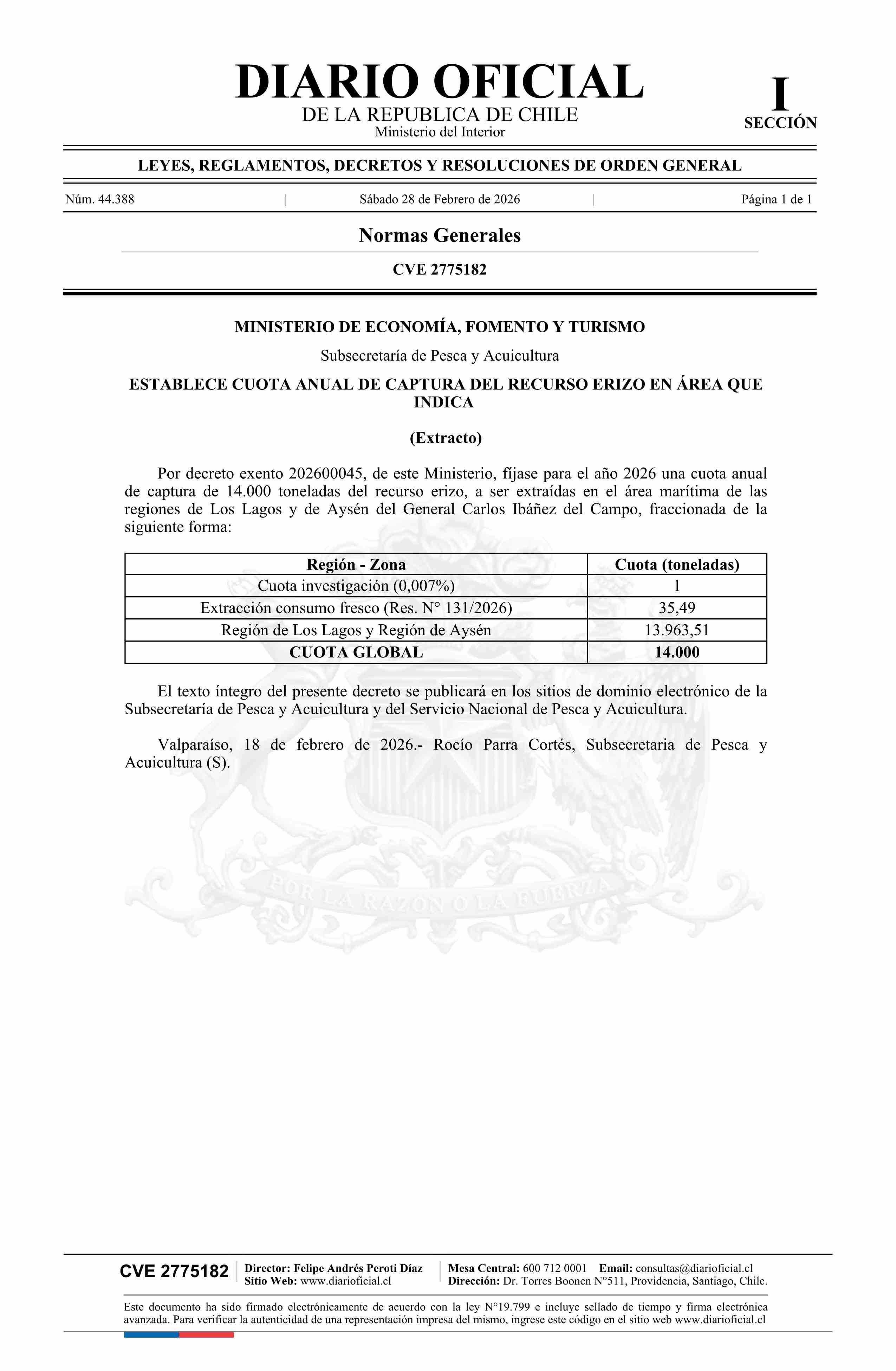 | Título: | Extracto de decreto exento número 202600045, de 2026.- Establece cuota anual de captura del recurso erizo en área que indica |