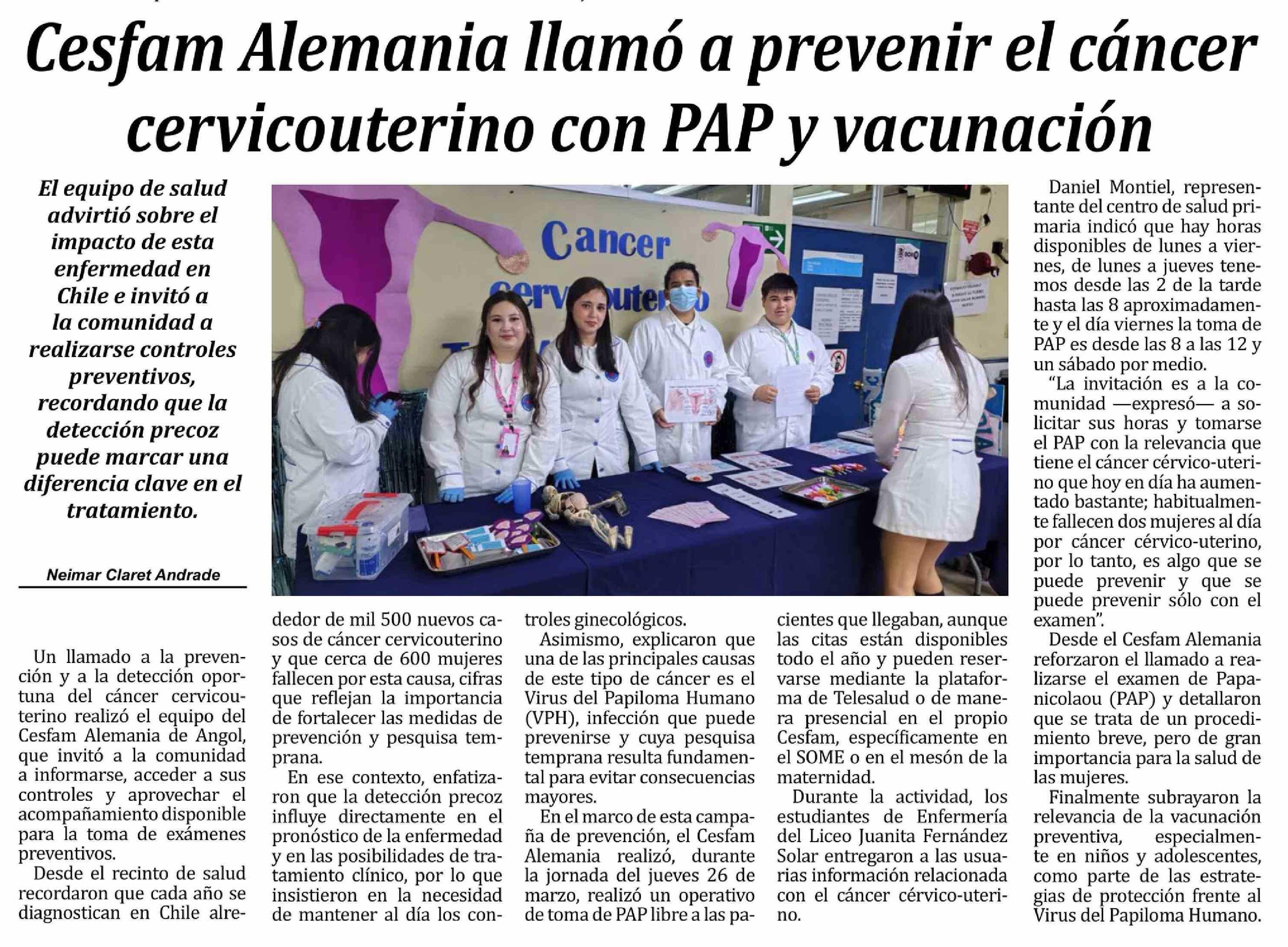 Título: Cesfam Alemania llamó a prevenir el cáncer cervicouterino con PAP y vacunación