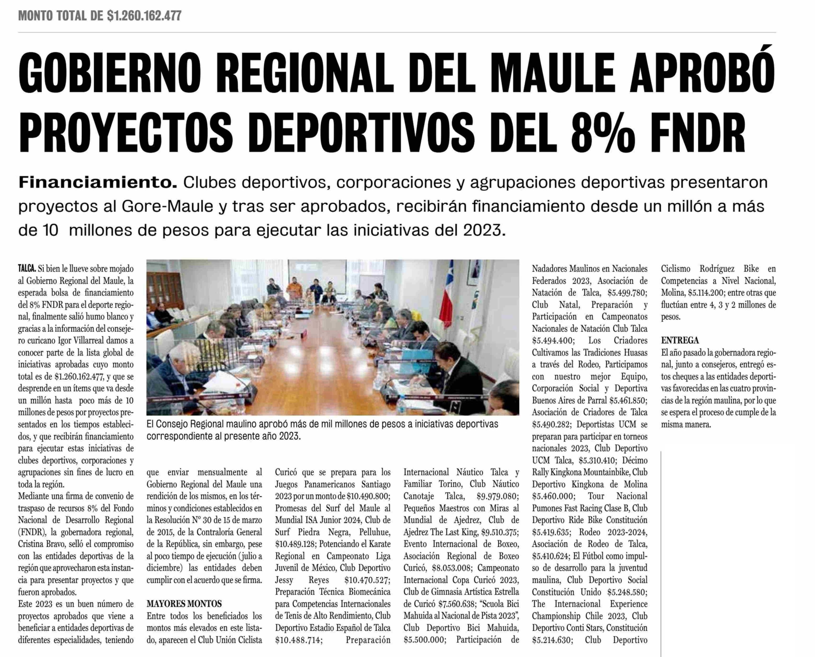 GOBIERNO REGIONAL DEL MAULE APROBÓ PROYECTOS DEPORTIVOS DEL 8% FNDR 15-07-2023 La Prensa de Curicó |