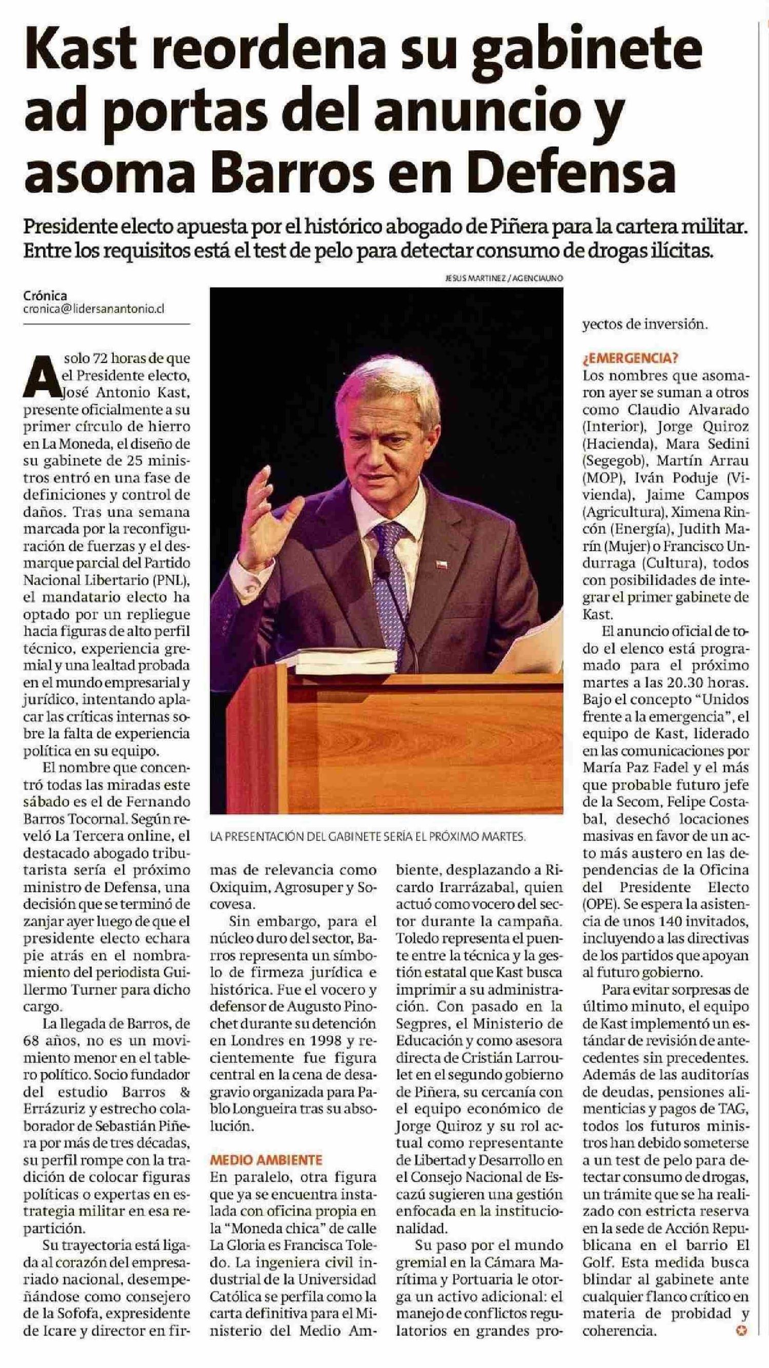 Título: Kast reordena su gabinete ad portas del anuncio y asoma Barros en Defensa