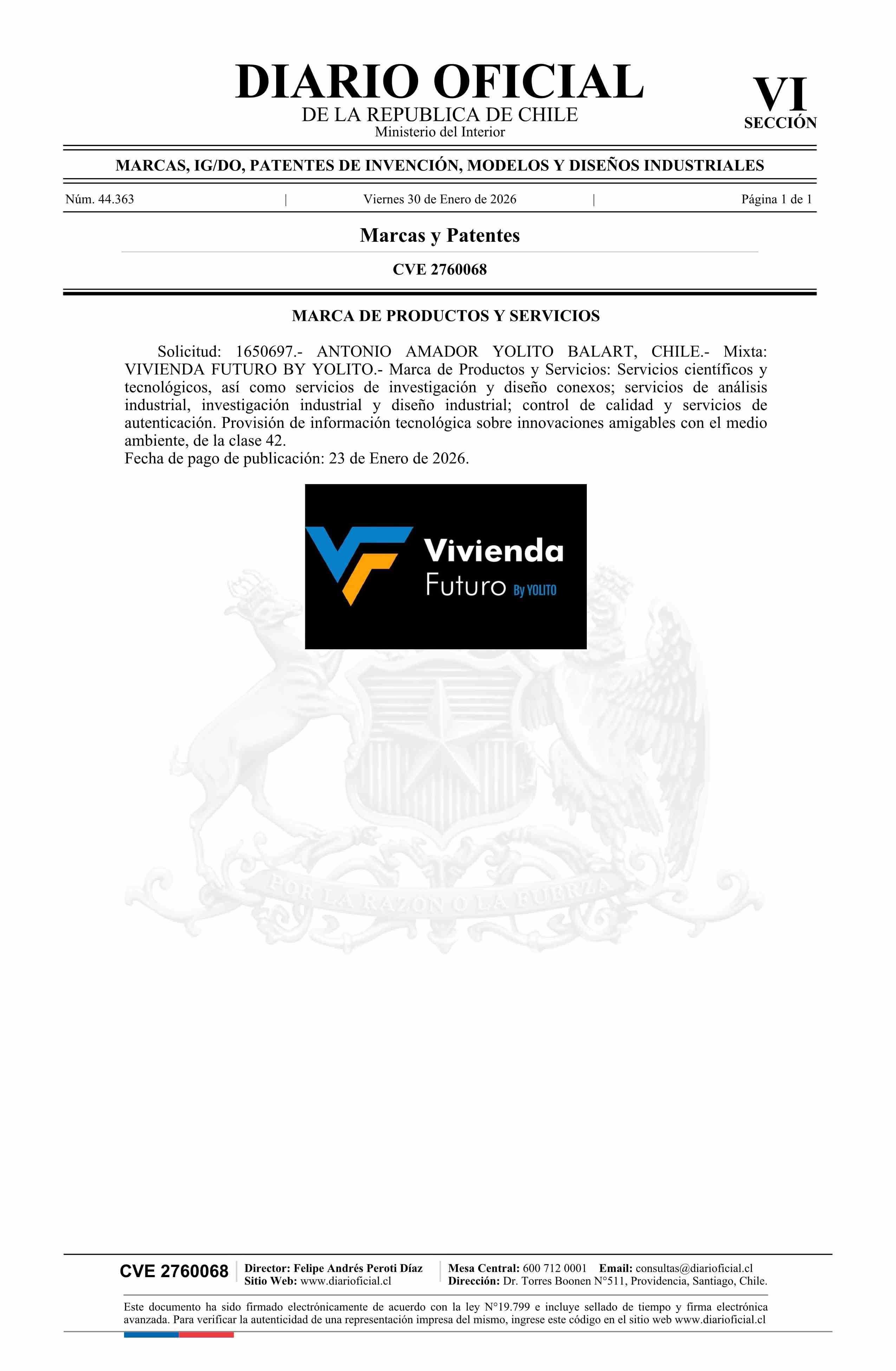 Solicitud número 1650697.- VIVIENDA FUTURO BY YOLITO 30-01-2026 Diario Oficial Edición Electrónica |