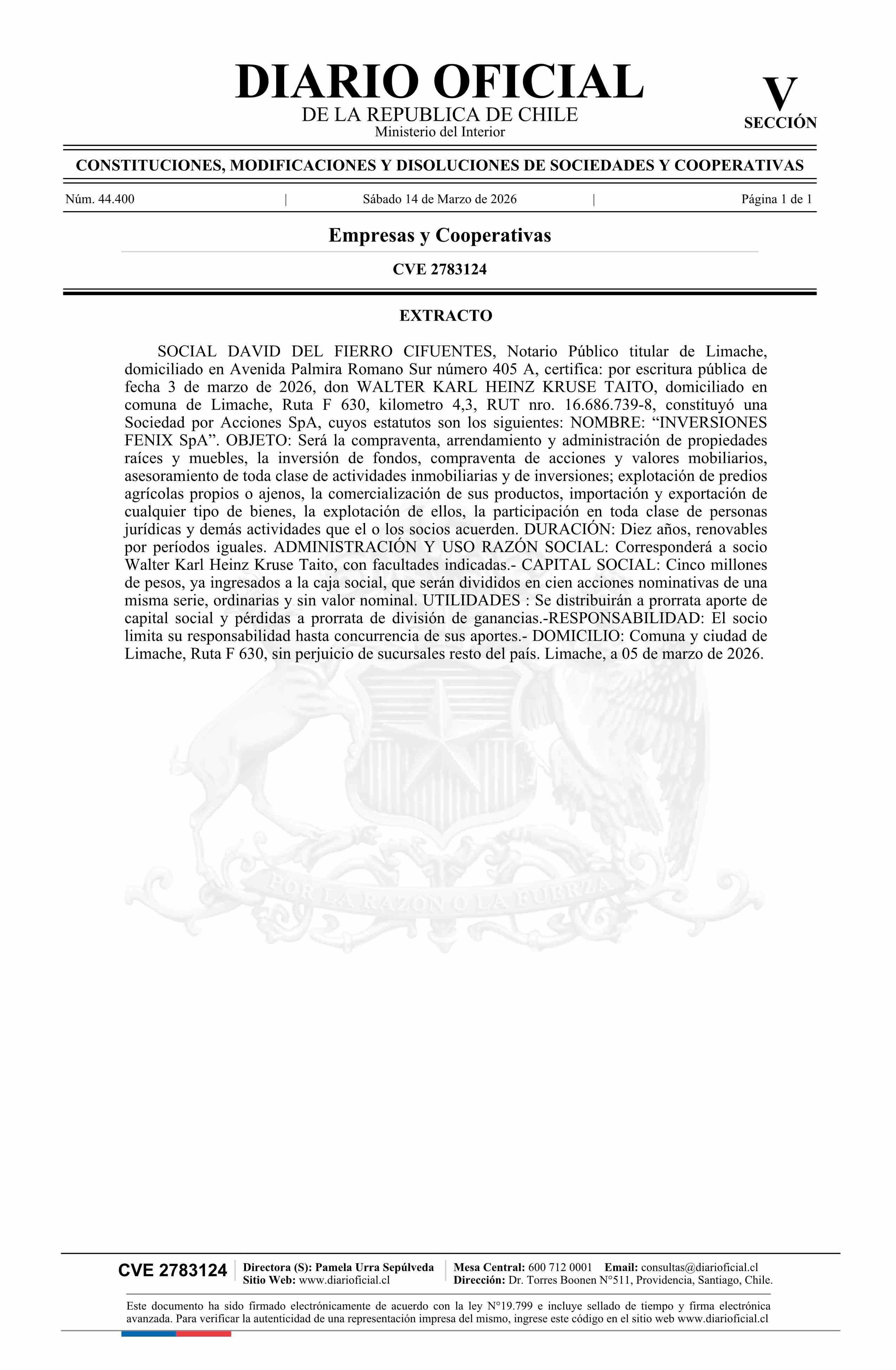 Título: INVERSIONES FENIX SpA