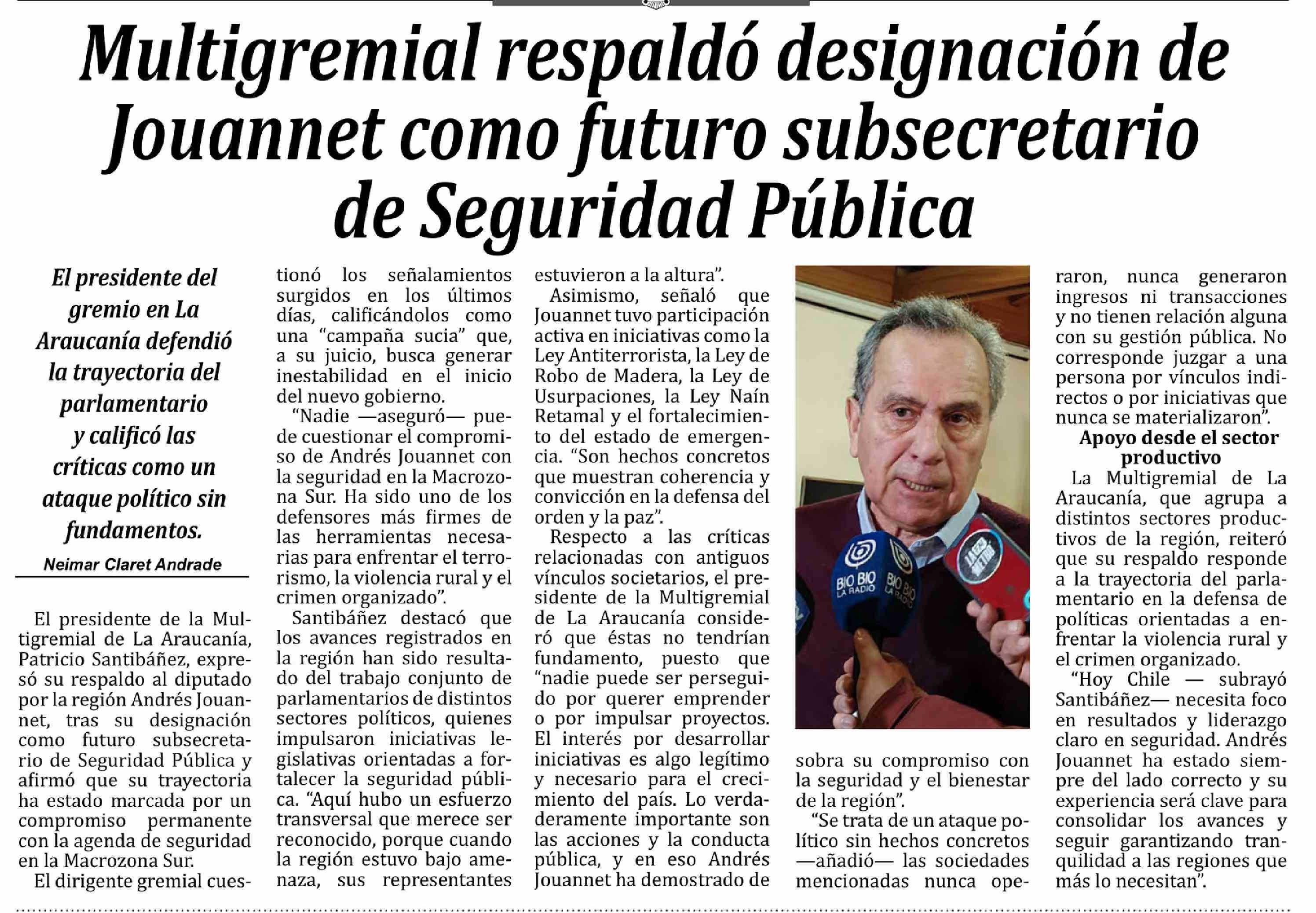 Título: Multigremial respaldó designación de Jouannet como futuro subsecretario de Seguridad Pública