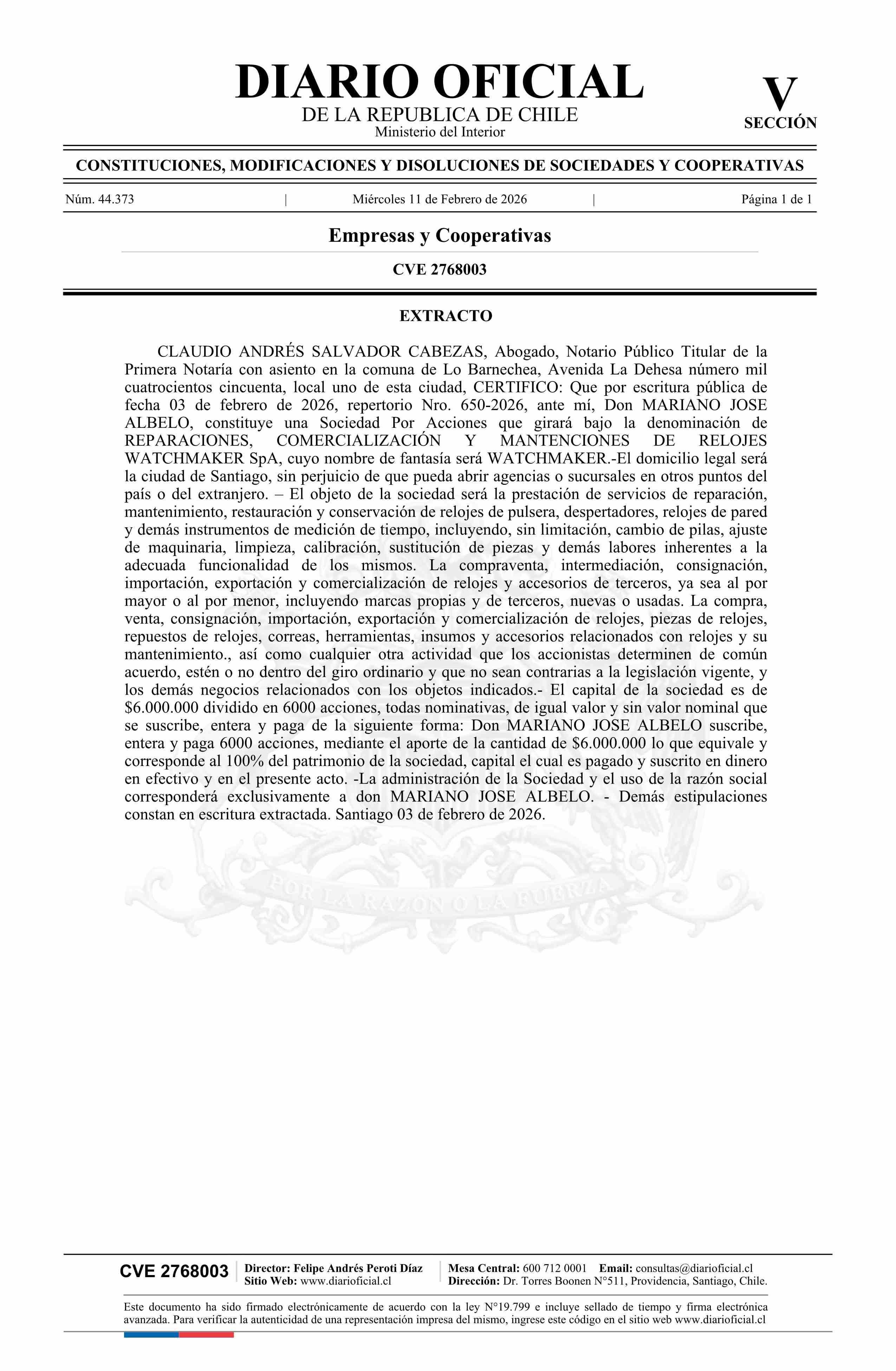 Título: REPARACIONES, COMERCIALIZACION Y MANTENCIONES DE RELOJES WATCHMAKER SpA