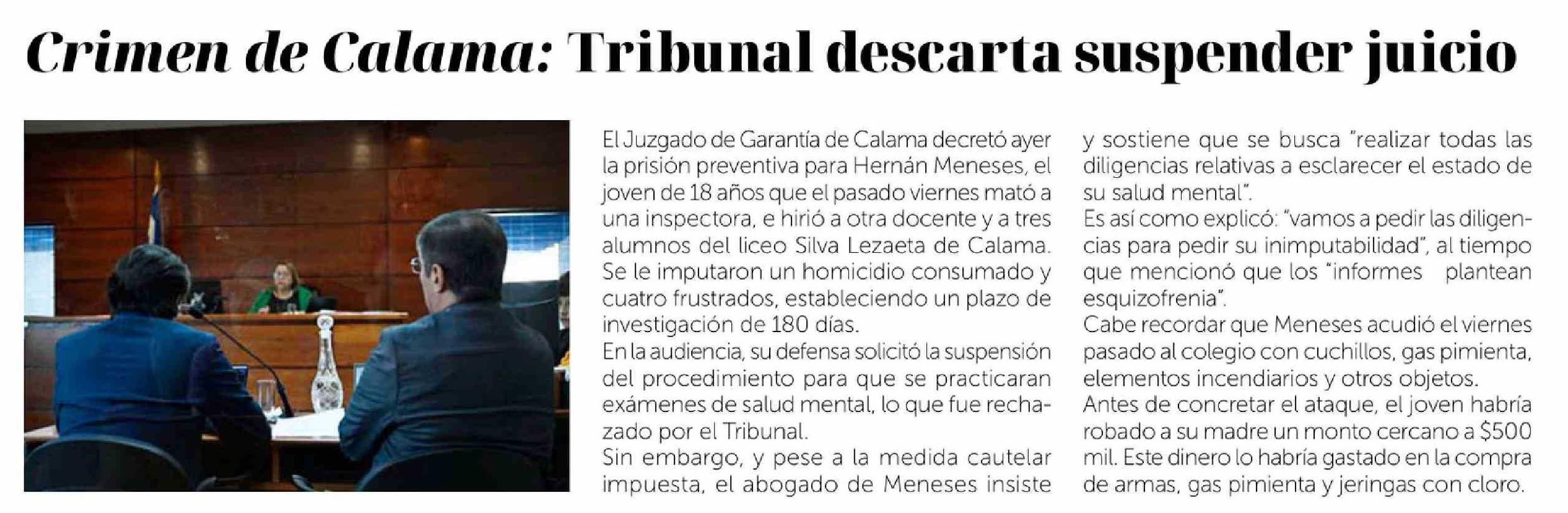| Título: | Crimen de Calama: Tribunal descarta suspender juicio |