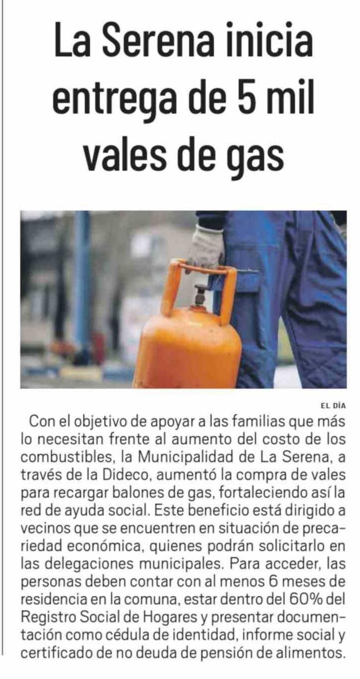 La Serena inicia entrega de 5 mil vales de gas 29-03-2026 El Día |