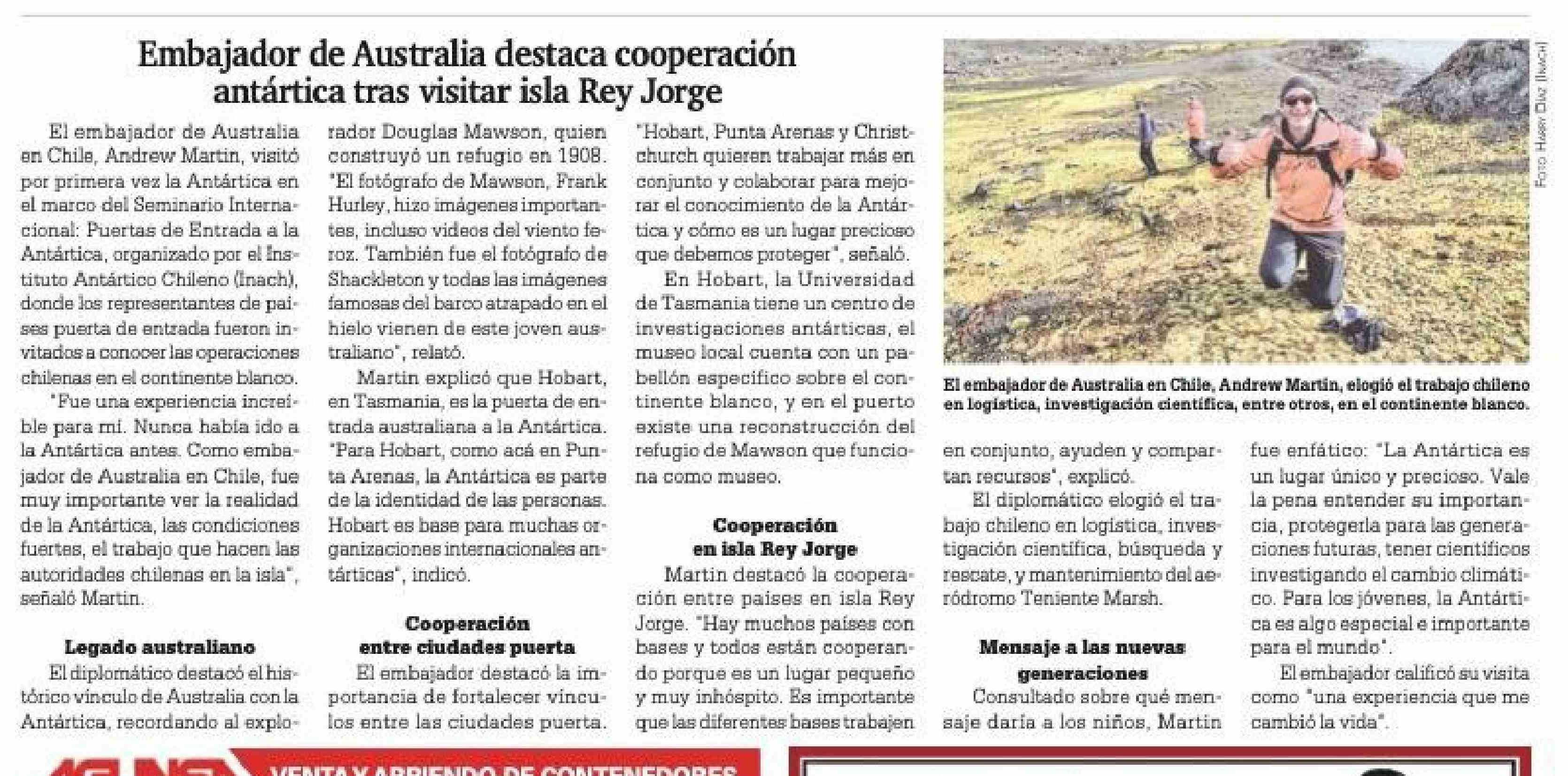 | Título: | Embajador de Australia destaca cooperación antártica tras visitar isla Rey Jorge El embajador de Australia rador Douglas Mawson, quien "Hobart, Punta Arenas y Christ- |