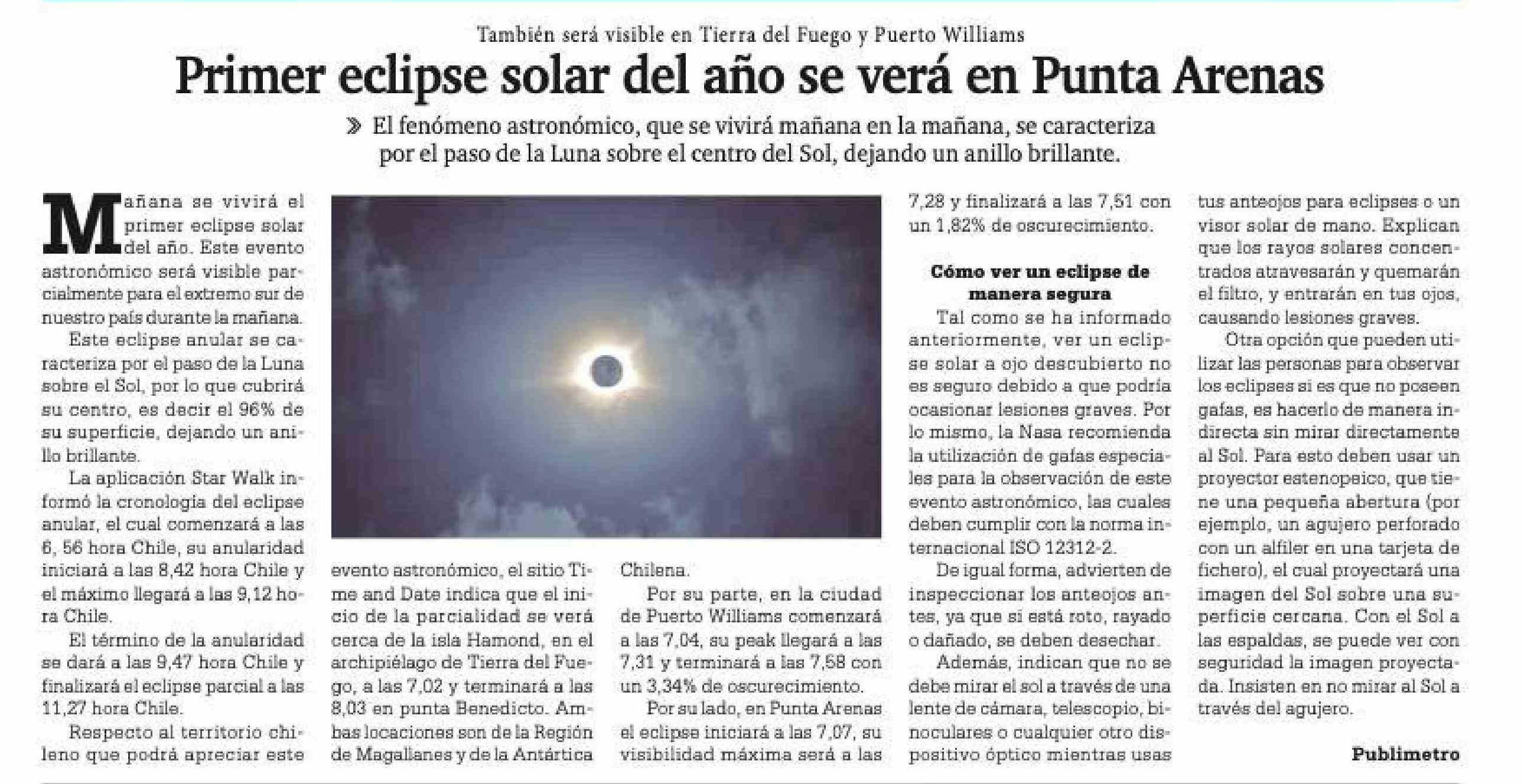 | Título: | Primer eclipse solar del año se verá en Punta Arenas |