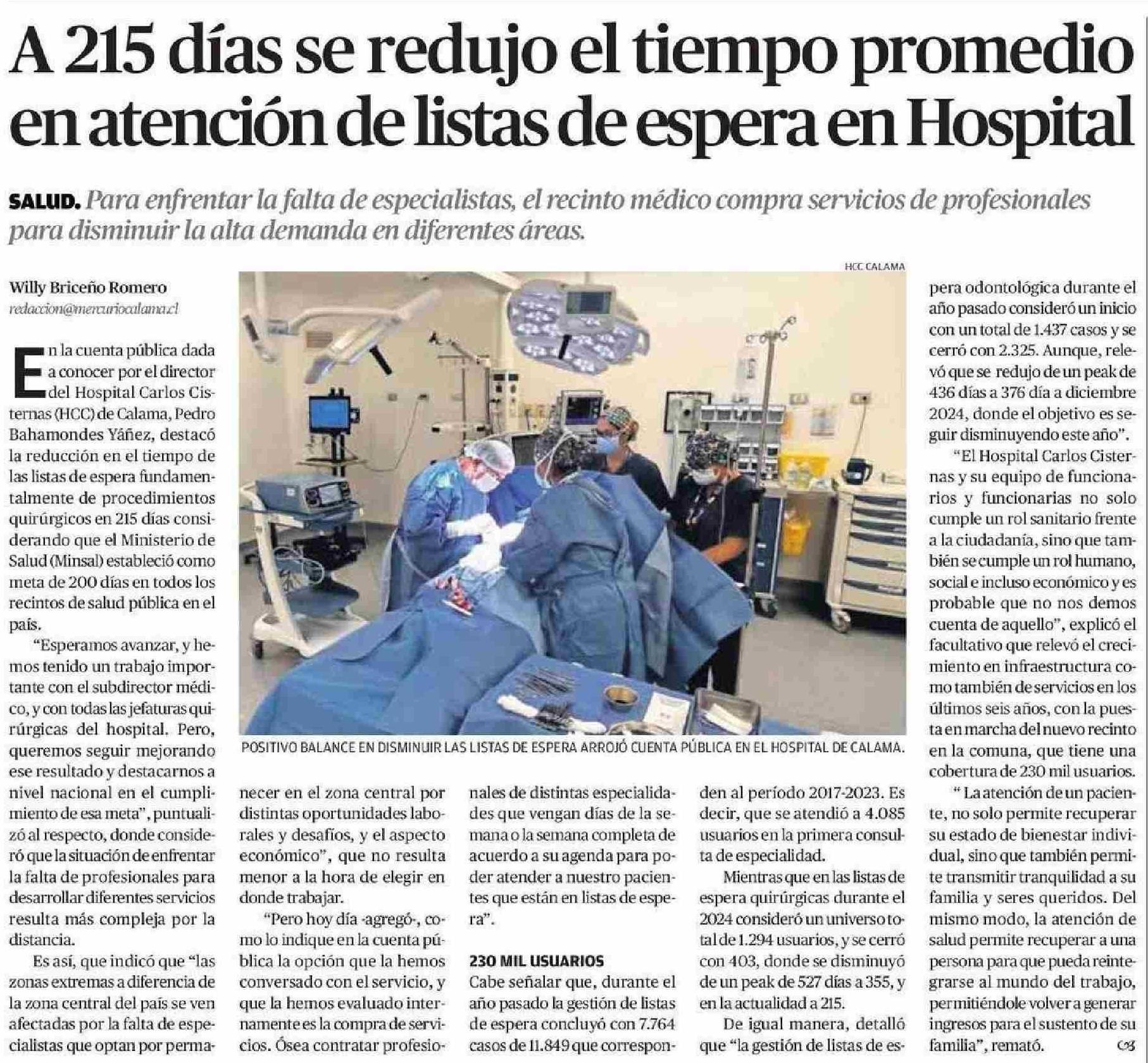 A 215 días se redujo el tiempo promedio en atención de listas de espera en Hospital 06-06-2025 El Mercurio de Calama |