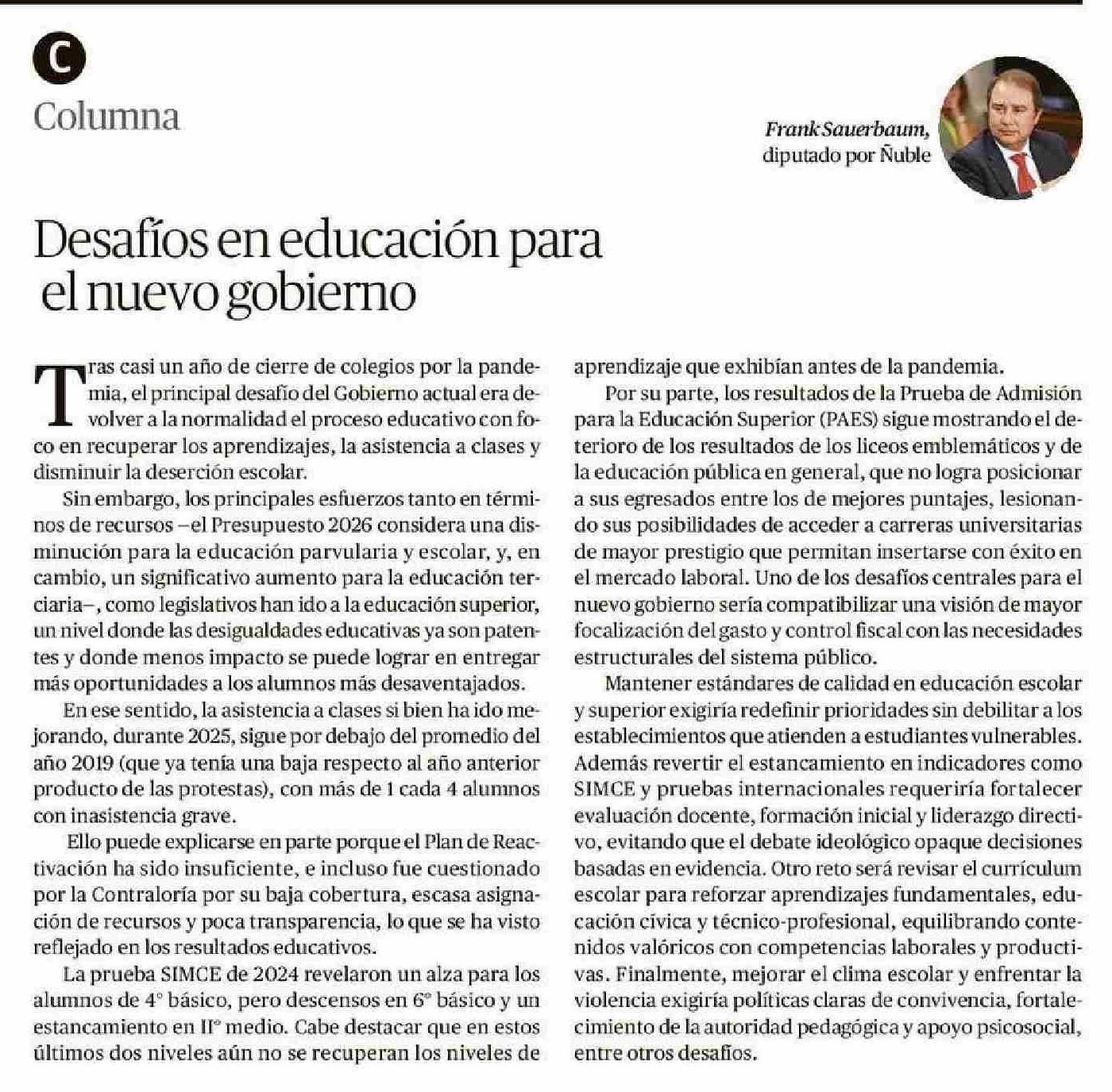 Columnas de Opinión: Desafíos en educación para el nuevo gobierno