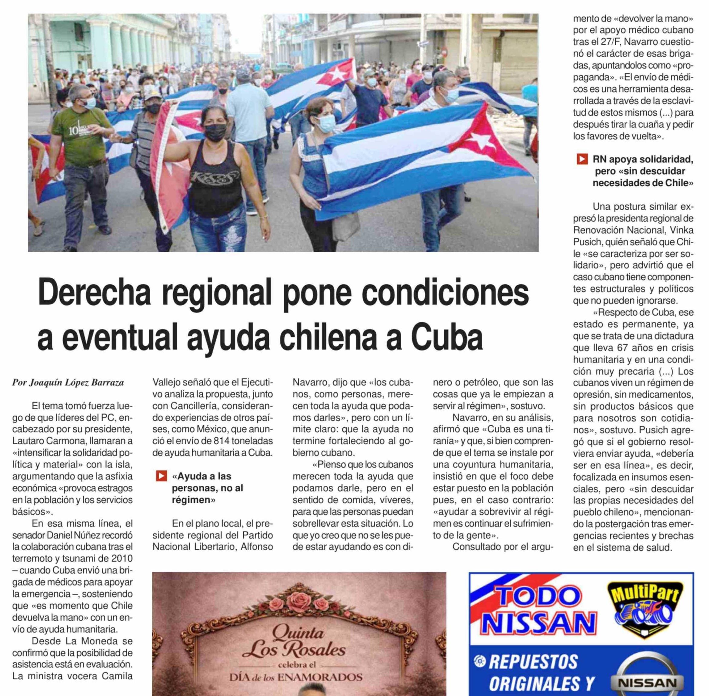 Título: Derecha regional pone condiciones a eventual ayuda chilena a Cuba