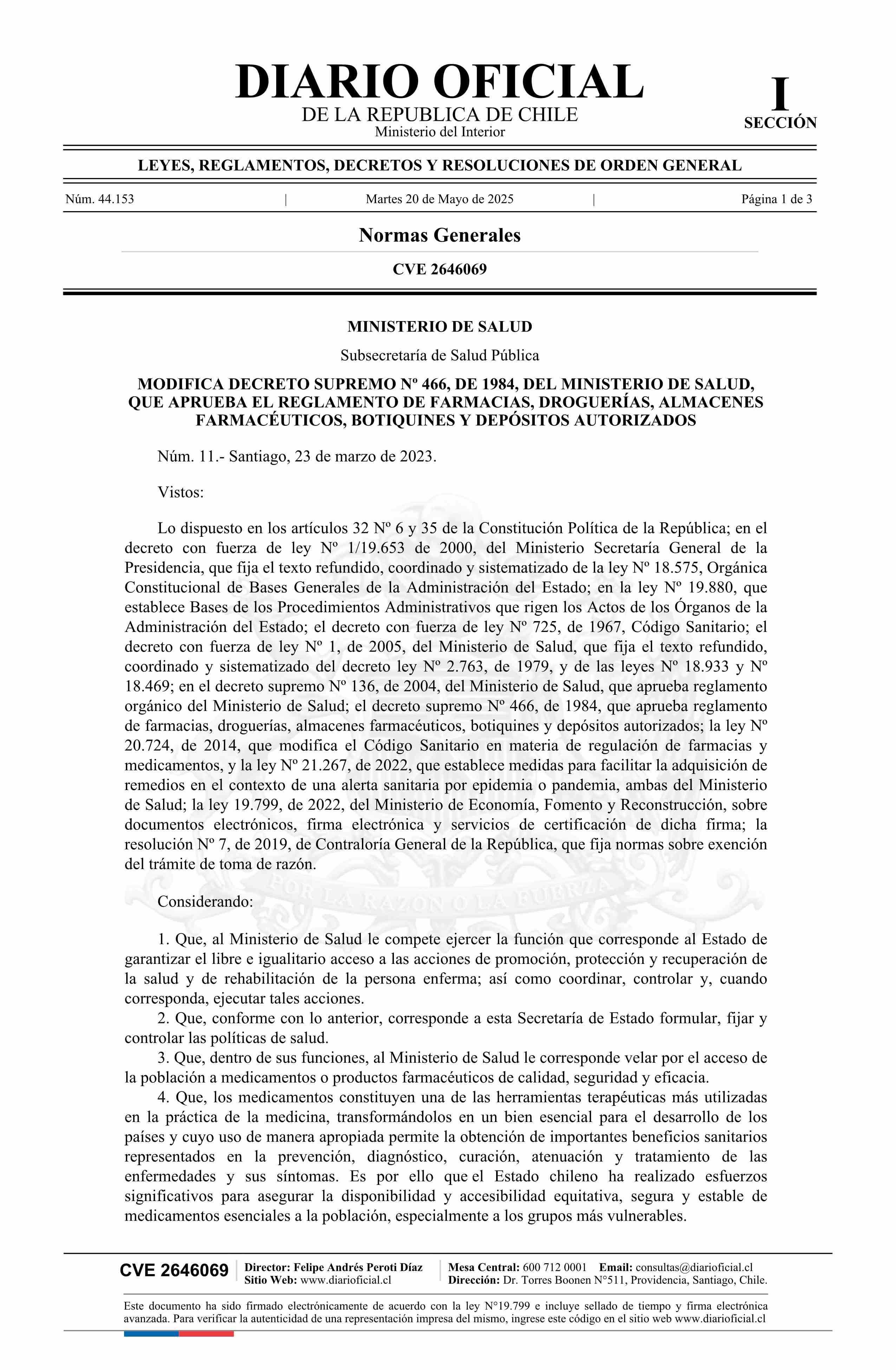 Título: Decreto número 11, de 2023.- Modifica decreto Nº 466, de 1984, que aprueba el Reglamento de farmacias, droguerías, almacenes farmacéuticos, botiquines y depósitos autorizados