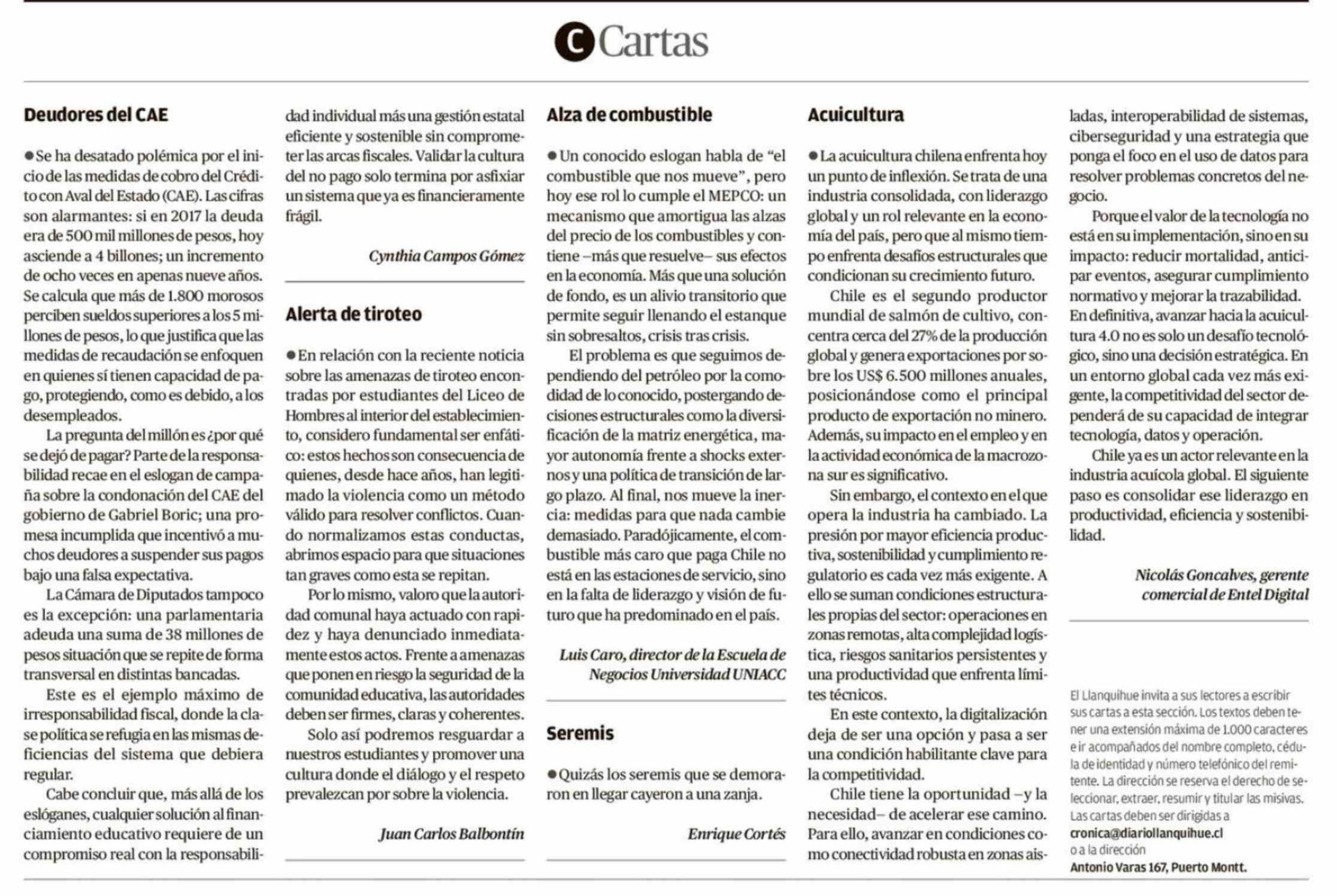 | Título: | Cartas: · Se ha desatado polémica por el inicio de las medidas de cobro del Crédito con Aval del Estado (CAE). Las cifras son alarmantes: si en 2017 la deuda era de 500 mil millones de pesos, hoy asciende a 4 billones; un incremento de ocho veces en apenas nueve años. Se calcula que más de 1.800 mor |